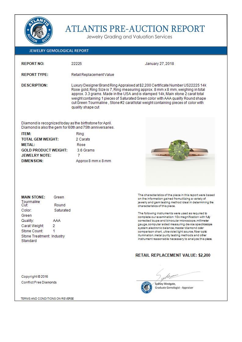 REF-33H6A -22225 ---- 2 CTW Green Tourmaline Designer Inspired Solitaire Engagement Ring 14K Rose Gold ---- Luxury Designer Brand Ring Appraised at $2,200 Certificate Number US22225 14k Rose gold, Ring Size is 7, Ring measuring approx. 8 mm x 8 mm, weighing in total approx. 3.3 grams. Made in the USA and is stamped 14k, Main stone 2 carat total weight containing 1 pieces of Saturated Green color with AAA quality Round shape cut Green Tourmaline , Stone #2 carat total weight containing pieces of color with quality shape cut