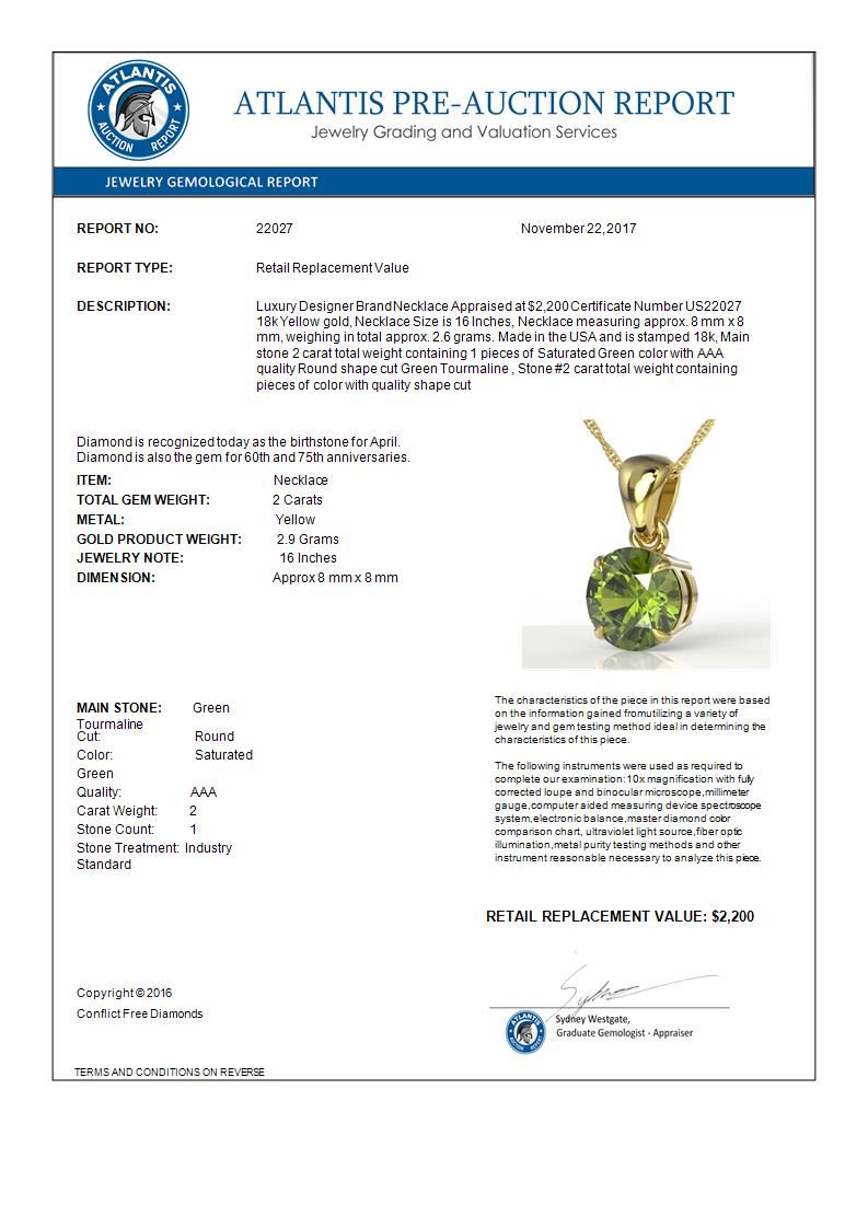 REF-33N3Y -22027 ---- 2 CTW Green Tourmaline Designer Solitaire Necklace 18K Yellow Gold ---- Luxury Designer Brand Necklace Appraised at $2,200 Certificate Number US22027 18k Yellow gold, Necklace Size is 16 Inches, Necklace measuring approx. 8 mm x 8 mm, weighing in total approx. 2.6 grams. Made in the USA and is stamped 18k, Main stone 2 carat total weight containing 1 pieces of Saturated Green color with AAA quality Round shape cut Green Tourmaline , Stone #2 carat total weight containing pieces of color with quality shape cut