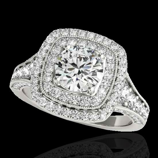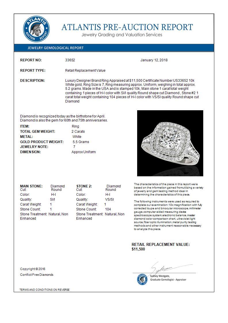 REF-209W3F -33652 ---- 2 CTW H-SI/I Certified Diamond Solitaire Halo Ring 10K White Gold ---- Luxury Designer Brand Ring Appraised at $11,500 Certificate Number US33652 10k White gold, Ring Size is 7, Ring measuring approx. Uniform, weighing in total approx. 5.2 grams. Made in the USA and is stamped 10k, Main stone 1 carat total weight containing 1 pieces of H-I color with SI/I quality Round shape cut Diamond , Stone #2 1 carat total weight containing 104 pieces of H-I color with VS/SI quality Round shape cut Diamond