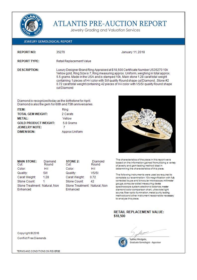 REF-305N5Y -35270 ---- 2 CTW H-SI/I Certified Diamond Solitaire Ring 10K Yellow Gold ---- Luxury Designer Brand Ring Appraised at $18,500 Certificate Number US35270 10k Yellow gold, Ring Size is 7, Ring measuring approx. Uniform, weighing in total approx. 5.5 grams. Made in the USA and is stamped 10k, Main stone 1.28 carat total weight containing 1 pieces of H-I color with SI/I quality Round shape cut Diamond , Stone #2 0.72 carat total weight containing 42 pieces of H-I color with VS/SI quality Round shape cut Diamond