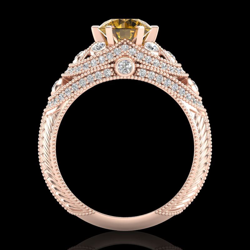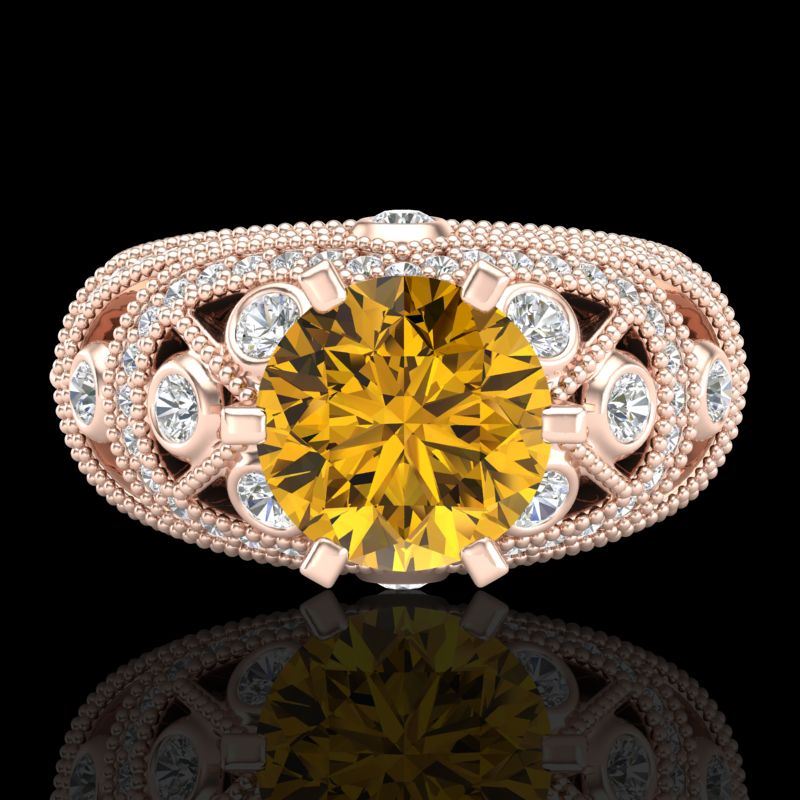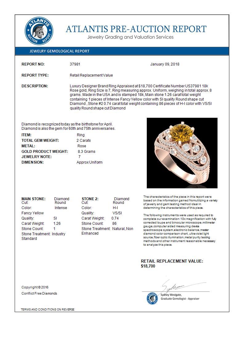 REF-309N3Y -37981 ---- 2 CTW Intense Yellow Diamond Solitaire Engagement Art Deco Ring 18K Rose Gold ---- Luxury Designer Brand Ring Appraised at $18,700 Certificate Number US37981 18k Rose gold, Ring Size is 7, Ring measuring approx. Uniform, weighing in total approx. 8 grams. Made in the USA and is stamped 18k, Main stone 1.26 carat total weight containing 1 pieces of Intense Fancy Yellow color with SI quality Round shape cut Diamond , Stone #2 0.74 carat total weight containing 86 pieces of H-I color with VS/SI quality Round shape cut Diamond