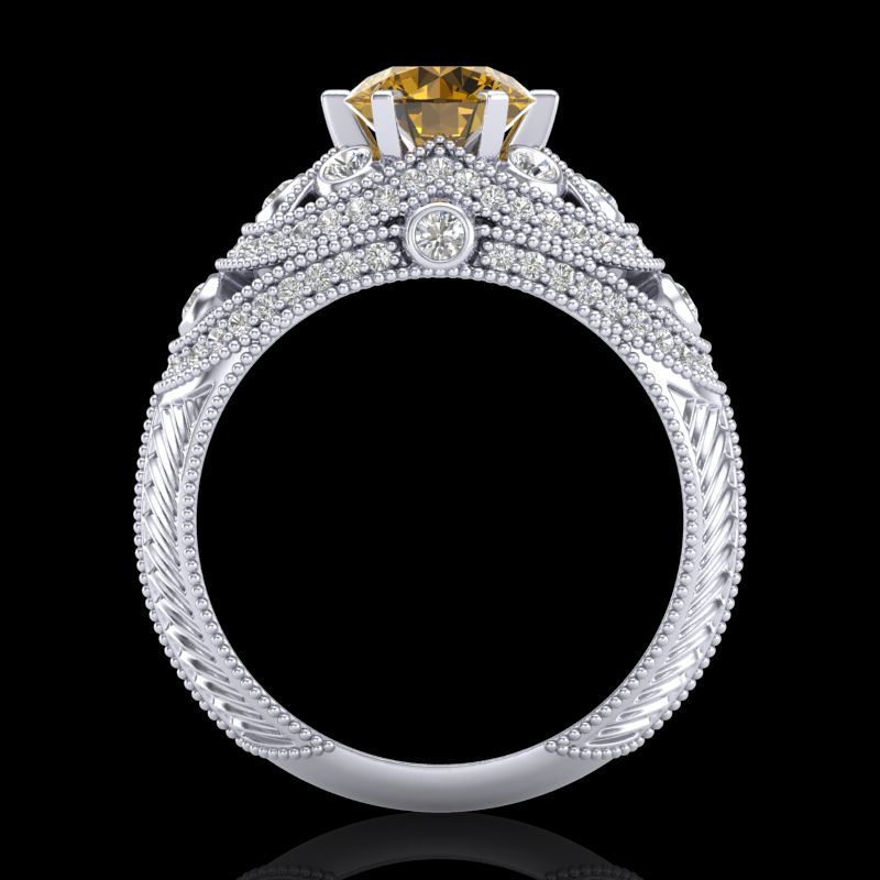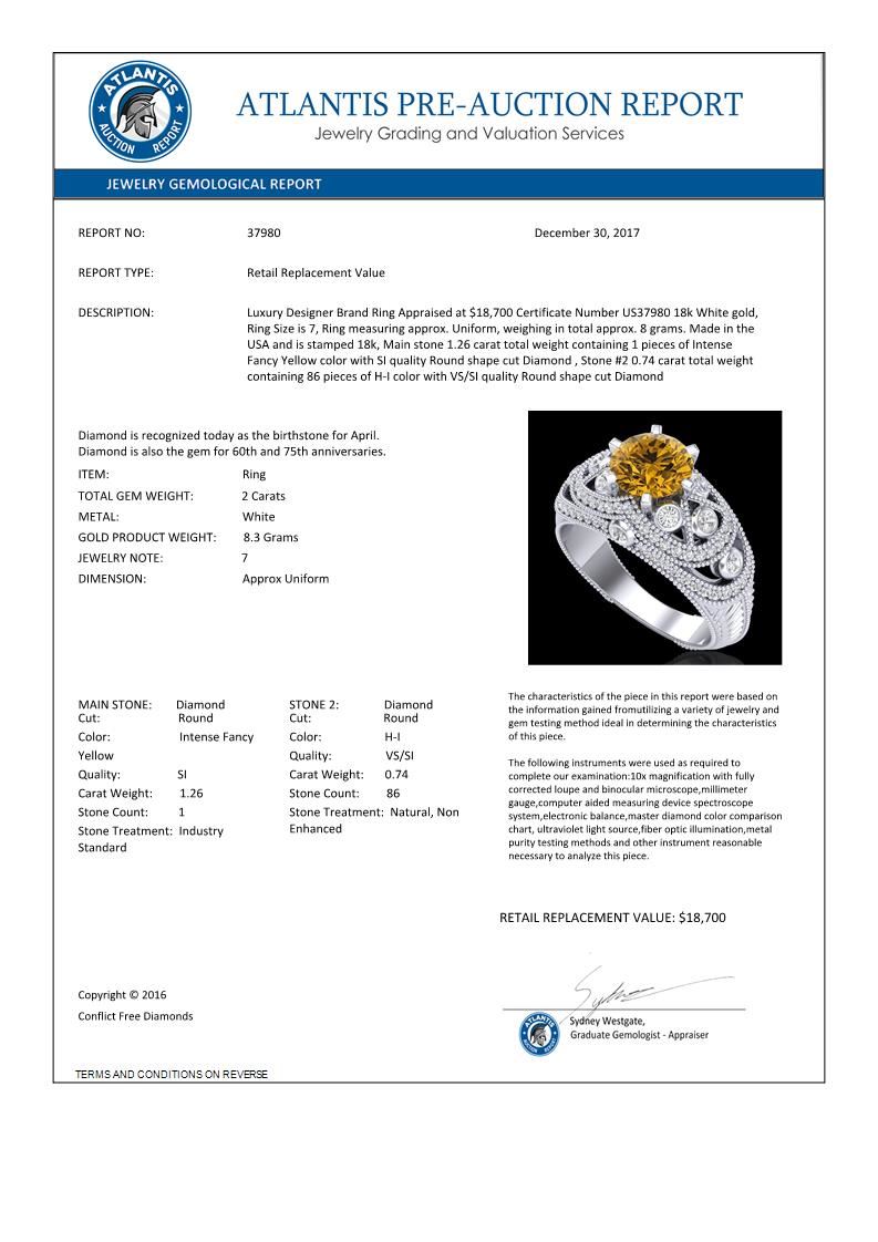 REF-309W3F -37980 ---- 2 CTW Intense Yellow Diamond Solitaire Engagement Art Deco Ring 18K White Gold ---- Luxury Designer Brand Ring Appraised at $18,700 Certificate Number US37980 18k White gold, Ring Size is 7, Ring measuring approx. Uniform, weighing in total approx. 8 grams. Made in the USA and is stamped 18k, Main stone 1.26 carat total weight containing 1 pieces of Intense Fancy Yellow color with SI quality Round shape cut Diamond , Stone #2 0.74 carat total weight containing 86 pieces of H-I color with VS/SI quality Round shape cut Diamond