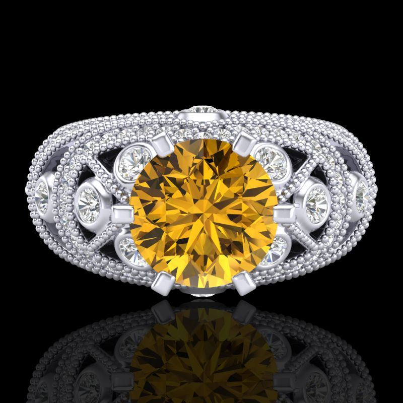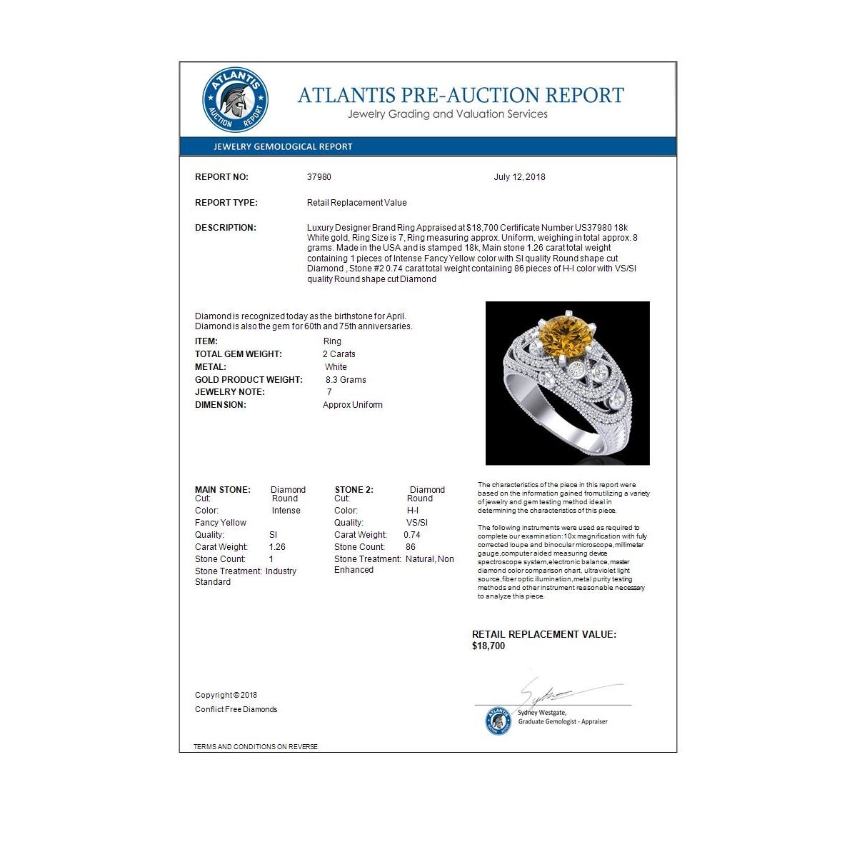 REF-309W3F -37980 ---- 2 CTW Intense Yellow Diamond Solitaire Engagement Art Deco Ring 18K White Gold ---- Luxury Designer Brand Ring Appraised at $18,700 Certificate Number US37980 18k White gold, Ring Size is 7, Ring measuring approx. Uniform, weighing in total approx. 8 grams. Made in the USA and is stamped 18k, Main stone 1.26 carat total weight containing 1 pieces of Intense Fancy Yellow color with SI quality Round shape cut Diamond , Stone #2 0.74 carat total weight containing 86 pieces of H-I color with VS/SI quality Round shape cut Diamond