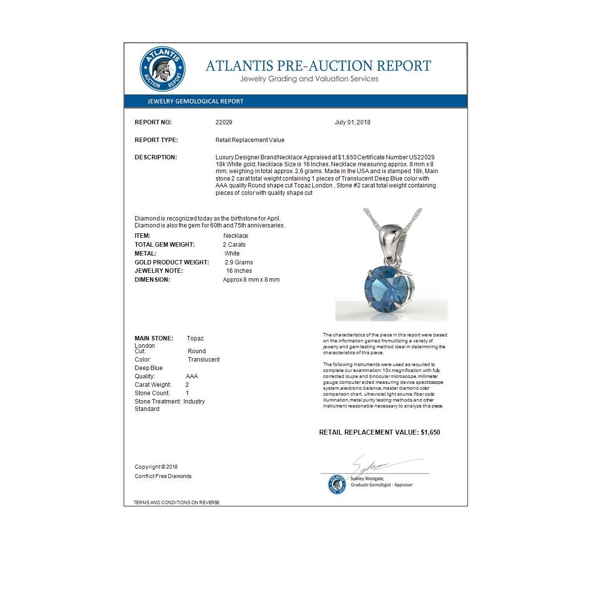 REF-24M9H -22029 ---- 2 CTW London Blue Topaz Designer Inspired Solitaire Necklace 18K White Gold ---- Luxury Designer Brand Necklace Appraised at $1,650 Certificate Number US22029 18k White gold, Necklace Size is 16 Inches, Necklace measuring approx. 8 mm x 8 mm, weighing in total approx. 2.6 grams. Made in the USA and is stamped 18k, Main stone 2 carat total weight containing 1 pieces of Translucent Deep Blue color with AAA quality Round shape cut Topaz London , Stone #2 carat total weight containing pieces of color with quality shape cut