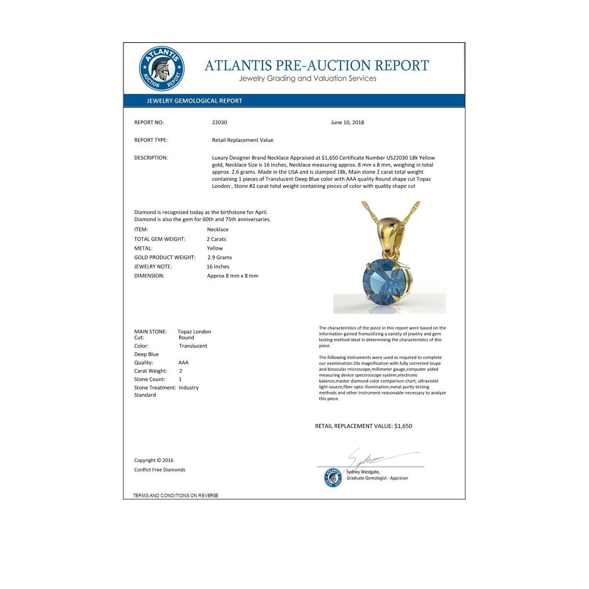 REF-24K9W -22030 ---- 2 CTW London Blue Topaz Designer Inspired Solitaire Necklace 18K Yellow Gold ---- Luxury Designer Brand Necklace Appraised at $1,650 Certificate Number US22030 18k Yellow gold, Necklace Size is 16 Inches, Necklace measuring approx. 8 mm x 8 mm, weighing in total approx. 2.6 grams. Made in the USA and is stamped 18k, Main stone 2 carat total weight containing 1 pieces of Translucent Deep Blue color with AAA quality Round shape cut Topaz London , Stone #2 carat total weight containing pieces of color with quality shape cut