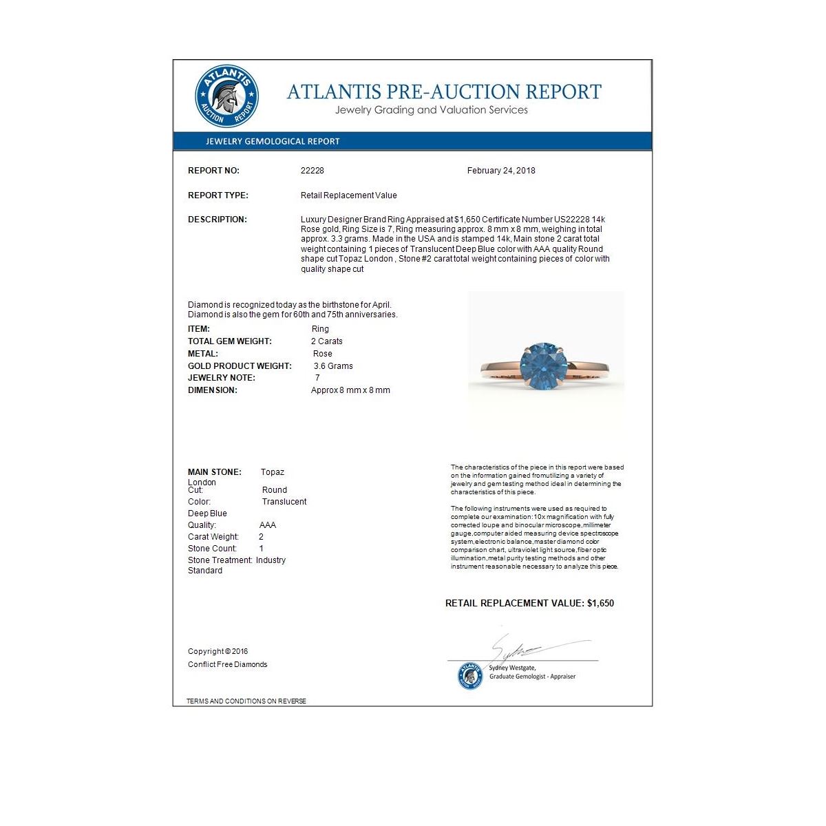 REF-25M3H -22228 ---- 2 CTW London Blue Topaz Inspired Solitaire Engagement Ring 14K Rose Gold ---- Luxury Designer Brand Ring Appraised at $1,650 Certificate Number US22228 14k Rose gold, Ring Size is 7, Ring measuring approx. 8 mm x 8 mm, weighing in total approx. 3.3 grams. Made in the USA and is stamped 14k, Main stone 2 carat total weight containing 1 pieces of Translucent Deep Blue color with AAA quality Round shape cut Topaz London , Stone #2 carat total weight containing pieces of color with quality shape cut