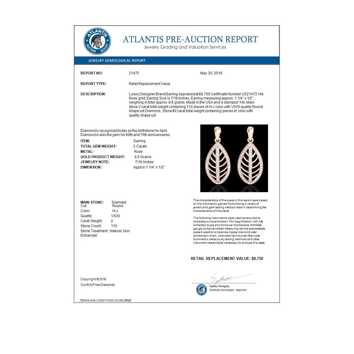 REF-159K5W -21473 ---- 2 CTW Micro Pave VS/SI Diamond Designer Earrings 14K Rose Gold ---- Luxury Designer Brand Earring Appraised at $8,750 Certificate Number US21473 14k Rose gold, Earring Size is 7/16 Inches, Earring measuring approx. 1 1/4" x 1/2" , weighing in total approx. 8.6 grams. Made in the USA and is stamped 14k, Main stone 2 carat total weight containing 110 pieces of H-J color with VS/SI quality Round shape cut Diamond , Stone #2 carat total weight containing pieces of color with quality shape cut