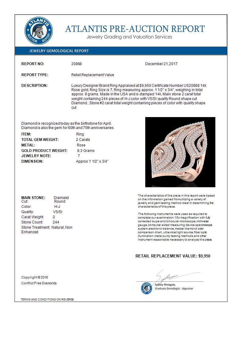 REF-180W9F -20868 ---- 2 CTW Micro Pave VS/SI Diamond Designer Ring 14K Rose Gold ---- Luxury Designer Brand Ring Appraised at $9,950 Certificate Number US20868 14k Rose gold, Ring Size is 7, Ring measuring approx. 1 1/2" x 3/4", weighing in total approx. 8 grams. Made in the USA and is stamped 14k, Main stone 2 carat total weight containing 244 pieces of H-J color with VS/SI quality Round shape cut Diamond , Stone #2 carat total weight containing pieces of color with quality shape cut