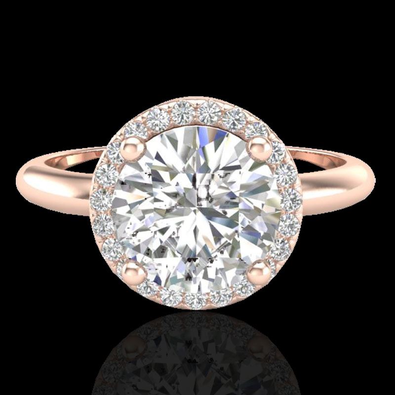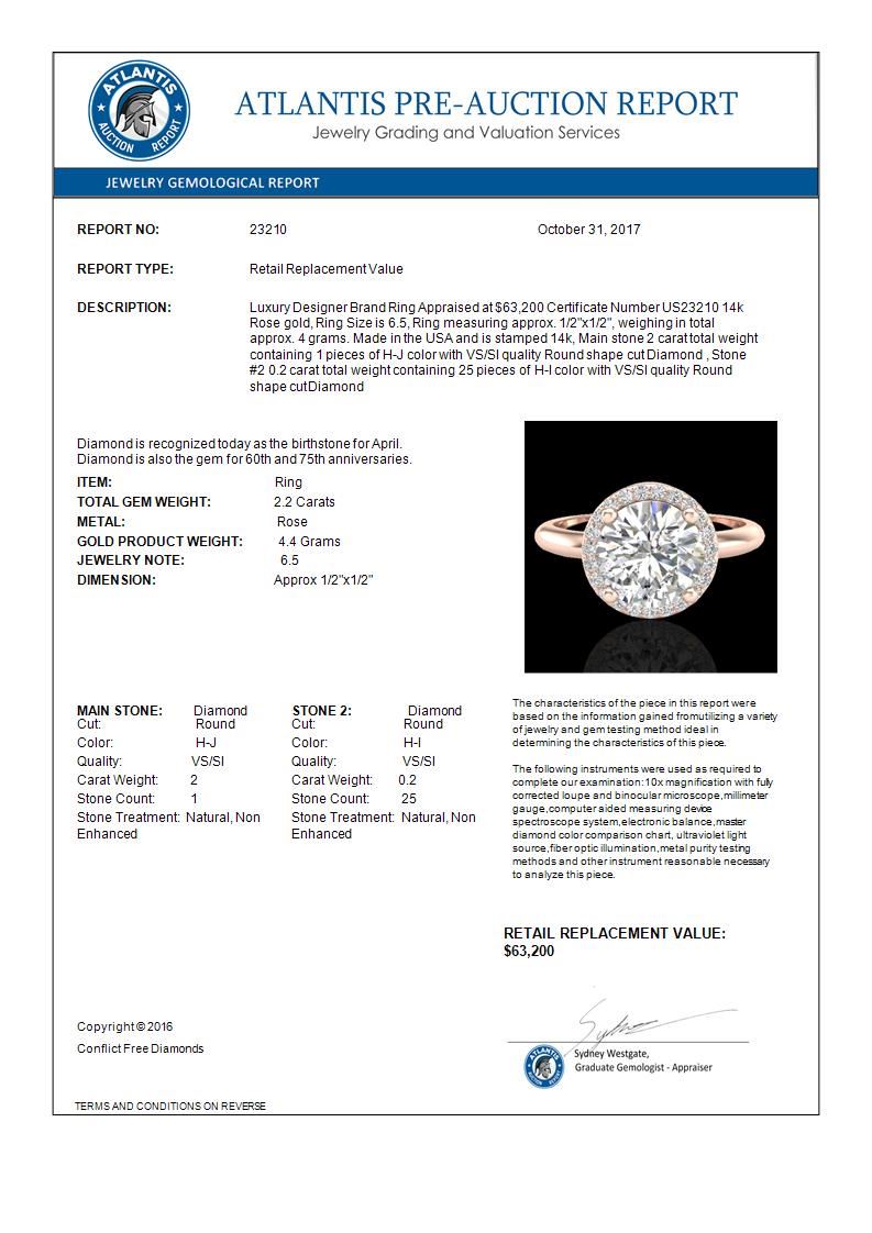 REF-948Y2K -23210 ---- 2 CTW Micro Pave VS/SI Diamond Ring Designer Halo 14K Rose Gold ---- Luxury Designer Brand Ring Appraised at $63,200 Certificate Number US23210 14k Rose gold, Ring Size is 6.5, Ring measuring approx. 1/2"x1/2", weighing in total approx. 4 grams. Made in the USA and is stamped 14k, Main stone 2 carat total weight containing 1 pieces of H-J color with VS/SI quality Round shape cut Diamond , Stone #2 0.2 carat total weight containing 25 pieces of H-I color with VS/SI quality Round shape cut Diamond
