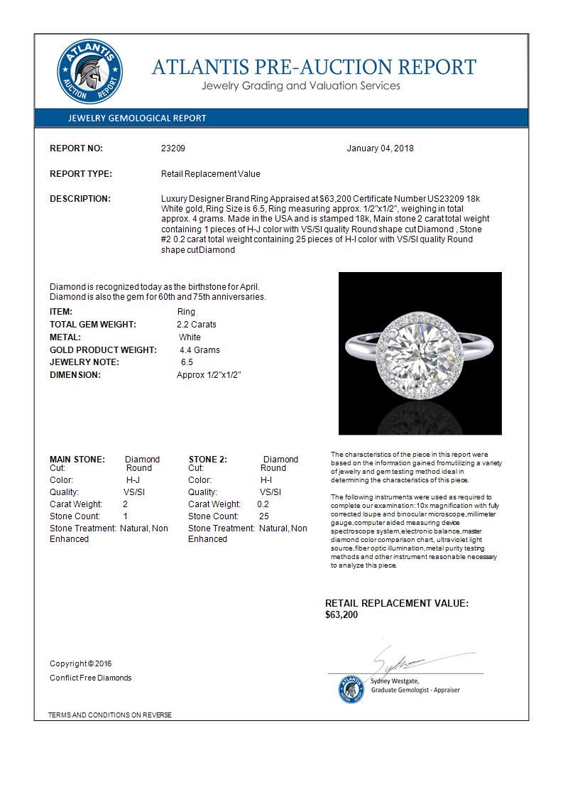 REF-948A2X -23209 ---- 2 CTW Micro Pave VS/SI Diamond Ring Designer Halo 18K White Gold ---- Luxury Designer Brand Ring Appraised at $63,200 Certificate Number US23209 18k White gold, Ring Size is 6.5, Ring measuring approx. 1/2"x1/2", weighing in total approx. 4 grams. Made in the USA and is stamped 18k, Main stone 2 carat total weight containing 1 pieces of H-J color with VS/SI quality Round shape cut Diamond , Stone #2 0.2 carat total weight containing 25 pieces of H-I color with VS/SI quality Round shape cut Diamond