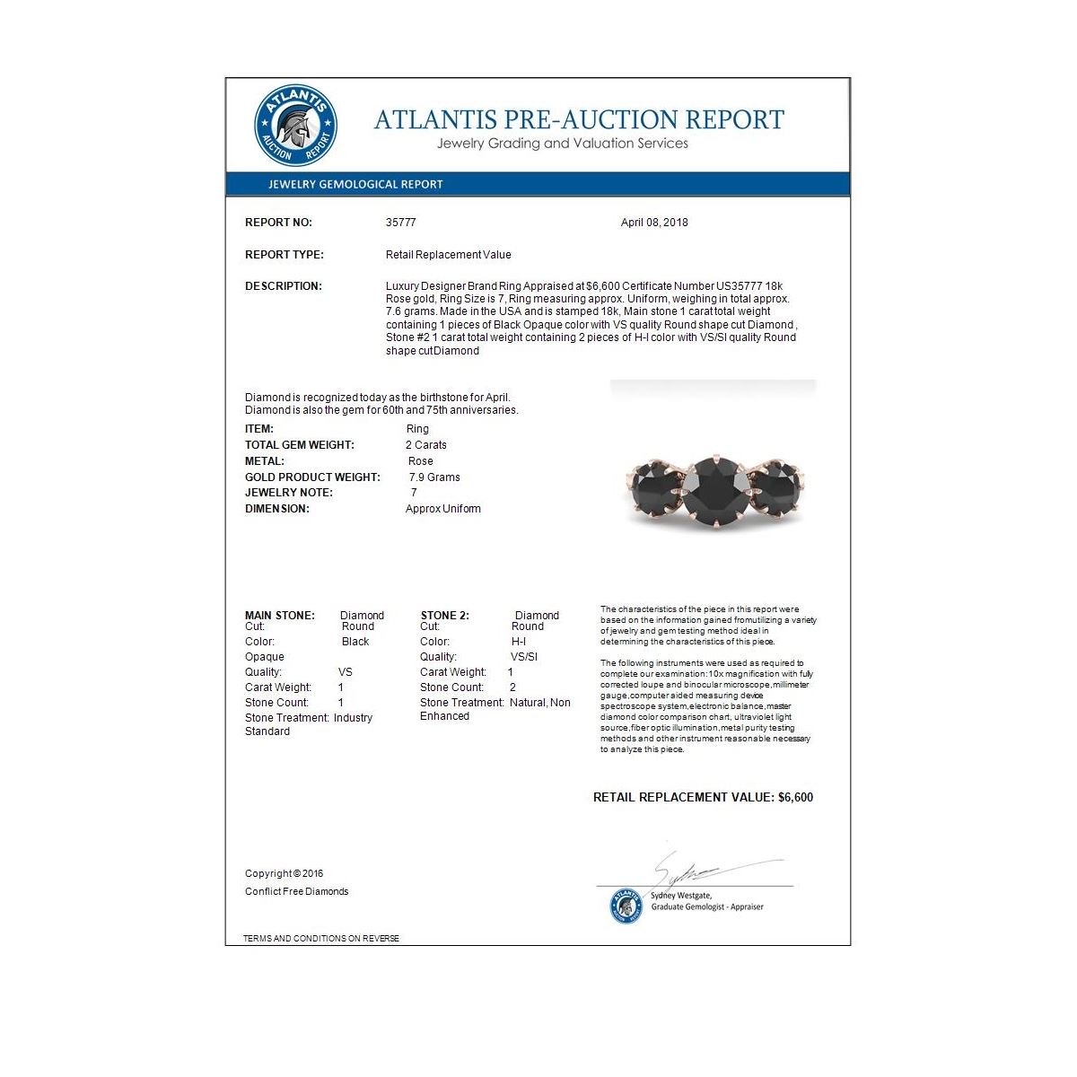REF-100A2X -35777 ---- 2 CTW Past Present Future Black Diamond Ring 18K Rose Gold ---- Luxury Designer Brand Ring Appraised at $6,600 Certificate Number US35777 18k Rose gold, Ring Size is 7, Ring measuring approx. Uniform, weighing in total approx. 7.6 grams. Made in the USA and is stamped 18k, Main stone 1 carat total weight containing 1 pieces of Black Opaque color with VS quality Round shape cut Diamond , Stone #2 1 carat total weight containing 2 pieces of H-I color with VS/SI quality Round shape cut Diamond