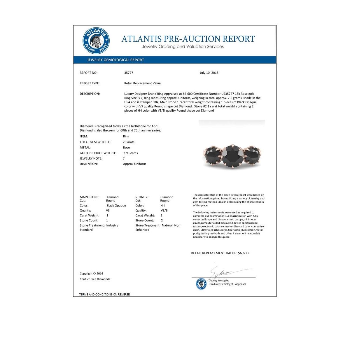 REF-100A2X -35777 ---- 2 CTW Past Present Future Black Diamond Ring 18K Rose Gold ---- Luxury Designer Brand Ring Appraised at $6,600 Certificate Number US35777 18k Rose gold, Ring Size is 7, Ring measuring approx. Uniform, weighing in total approx. 7.6 grams. Made in the USA and is stamped 18k, Main stone 1 carat total weight containing 1 pieces of Black Opaque color with VS quality Round shape cut Diamond , Stone #2 1 carat total weight containing 2 pieces of H-I color with VS/SI quality Round shape cut Diamond