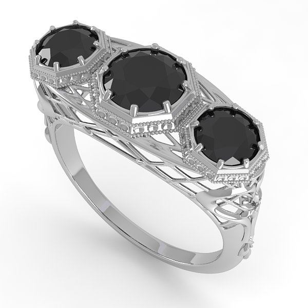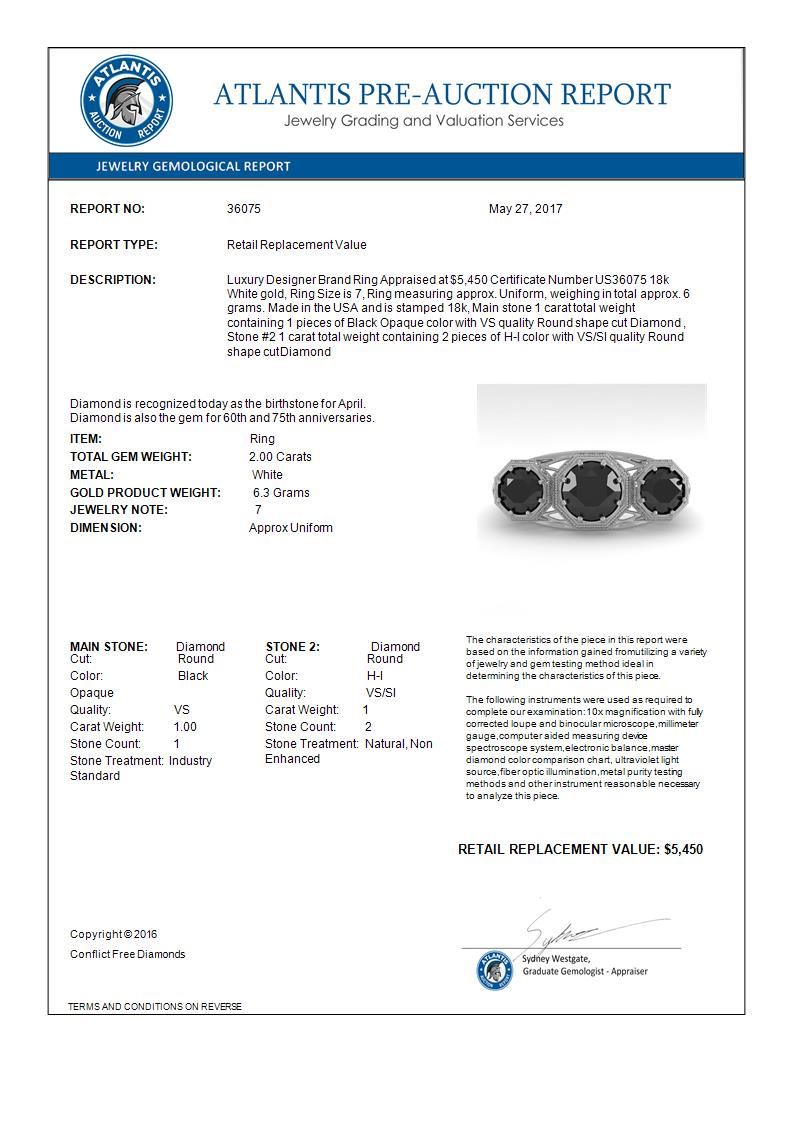 2 CTW Past Present Future Black Diamond Ring 18K White Gold ---- Luxury Designer Brand Ring Appraised Retail Price at $5,450 ---- SKU Number US36075 18k White gold Ring Size is 7, Ring measuring approx. Uniform, weighing in total approx. 6 grams. Made in the USA and is stamped 18k, Main stone 1.00 carat total weight containing 1 pieces of Black Opaque color with VS quality Round shape cut Diamond , Stone #2 1 carat total weight containing 2 pieces of H-I color with VS/SI quality Round shape cut