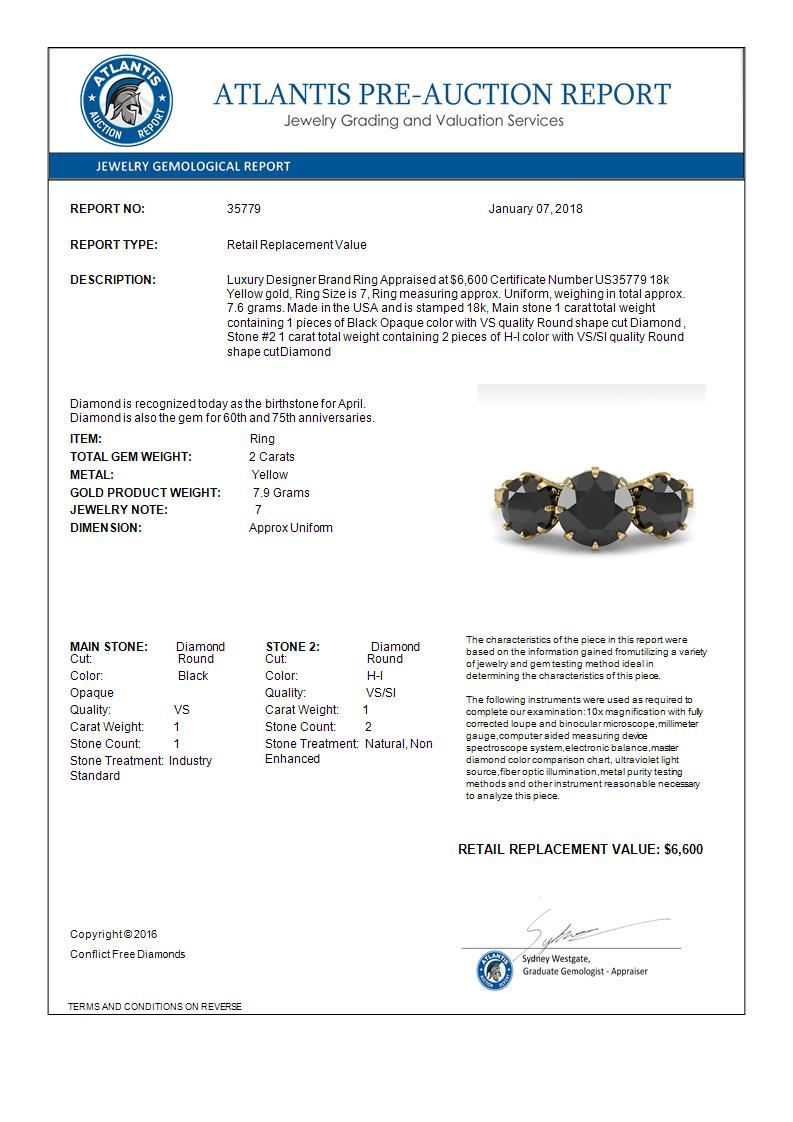 REF-100M2H -35779 ---- 2 CTW Past Present Future Black Diamond Ring 18K Yellow Gold ---- Luxury Designer Brand Ring Appraised at $6,600 Certificate Number US35779 18k Yellow gold, Ring Size is 7, Ring measuring approx. Uniform, weighing in total approx. 7.6 grams. Made in the USA and is stamped 18k, Main stone 1 carat total weight containing 1 pieces of Black Opaque color with VS quality Round shape cut Diamond , Stone #2 1 carat total weight containing 2 pieces of H-I color with VS/SI quality Round shape cut Diamond