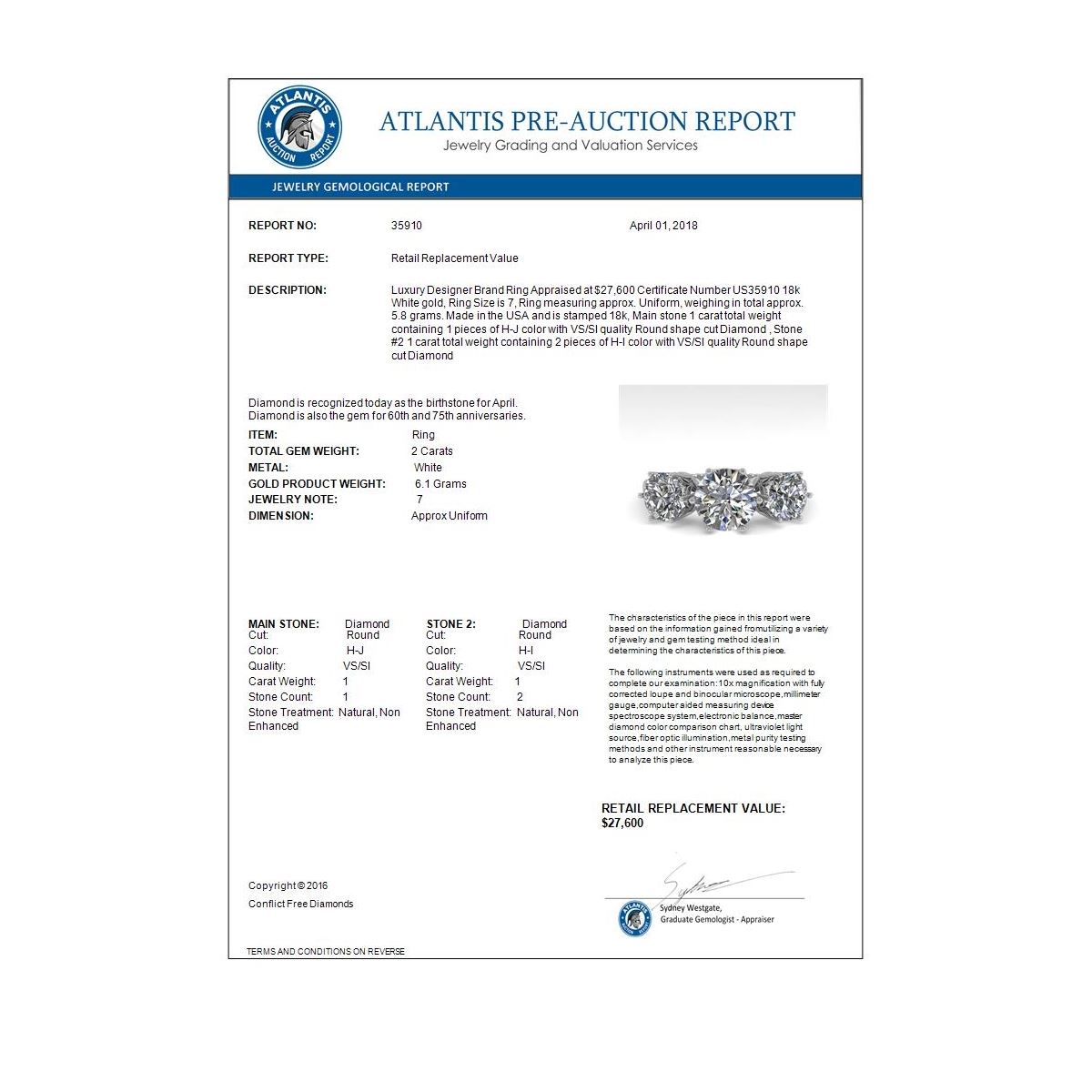 REF-414A2X -35910 ---- 2 CTW Past Present Future Certified VS/SI Diamond Ring 18K White Gold ---- Luxury Designer Brand Ring Appraised at $27,600 Certificate Number US35910 18k White gold, Ring Size is 7, Ring measuring approx. Uniform, weighing in total approx. 5.8 grams. Made in the USA and is stamped 18k, Main stone 1 carat total weight containing 1 pieces of H-J color with VS/SI quality Round shape cut Diamond , Stone #2 1 carat total weight containing 2 pieces of H-I color with VS/SI quality Round shape cut Diamond