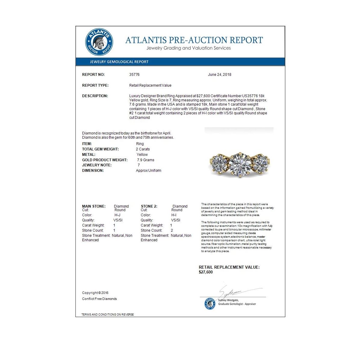 REF-414Y2K -35776 ---- 2 CTW Past Present Future Certified VS/SI Diamond Ring 18K Yellow Gold ---- Luxury Designer Brand Ring Appraised at $27,600 Certificate Number US35776 18k Yellow gold, Ring Size is 7, Ring measuring approx. Uniform, weighing in total approx. 7.6 grams. Made in the USA and is stamped 18k, Main stone 1 carat total weight containing 1 pieces of H-J color with VS/SI quality Round shape cut Diamond , Stone #2 1 carat total weight containing 2 pieces of H-I color with VS/SI quality Round shape cut Diamond