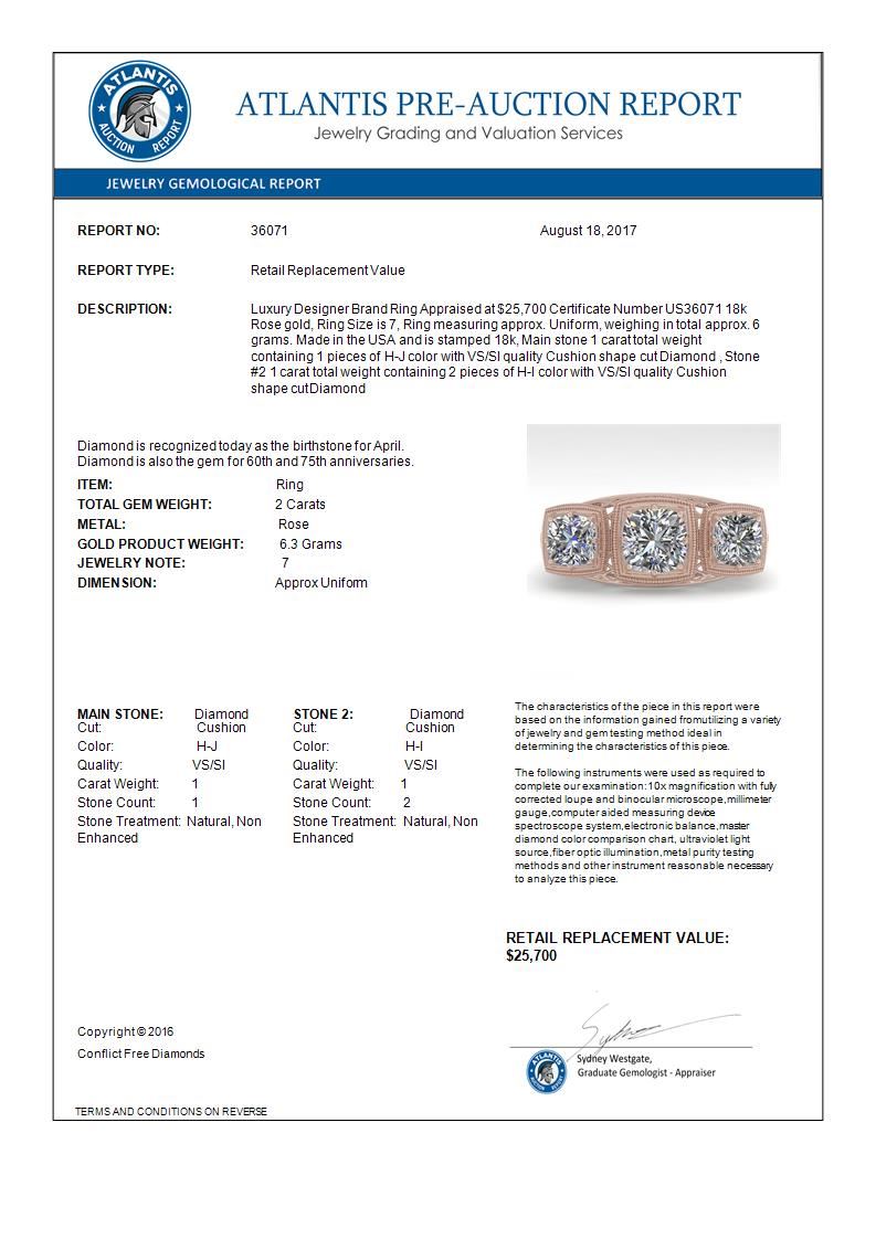36071 - REF-481N6A ---- 2 CTW Past Present Future VS/SI Cushion Cut Diamond Ring Deco 18K Rose Gold ---- Luxury Designer Brand Ring Appraised at $25,700 Certificate Number US36071 18k Rose gold, Ring Size is 7, Ring measuring approx. Uniform, weighing in total approx. 6 grams. Made in the USA and is stamped 18k, Main stone 1 carat total weight containing 1 pieces of H-J color with VS/SI quality Cushion shape cut Diamond , Stone #2 1 carat total weight containing 2 pieces of H-I color with VS/SI quality Cushion shape cut Diamond