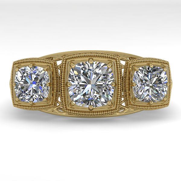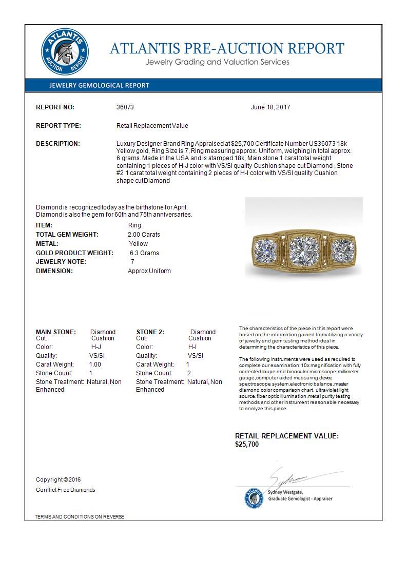 2 CTW Past Present Future VS/SI Cushion Cut Diamond Ring Deco 18K Yellow Gold ---- Luxury Designer Brand Ring Appraised Retail Price at $25,700 ---- SKU Number US36073 18k Yellow gold Ring Size is 7, Ring measuring approx. Uniform, weighing in total approx. 6 grams. Made in the USA and is stamped 18k, Main stone 1.00 carat total weight containing 1 pieces of H-J color with VS/SI quality Cushion shape cut Diamond , Stone #2 1 carat total weight containing 2 pieces of H-I color with VS/SI quality Cushion shape cut