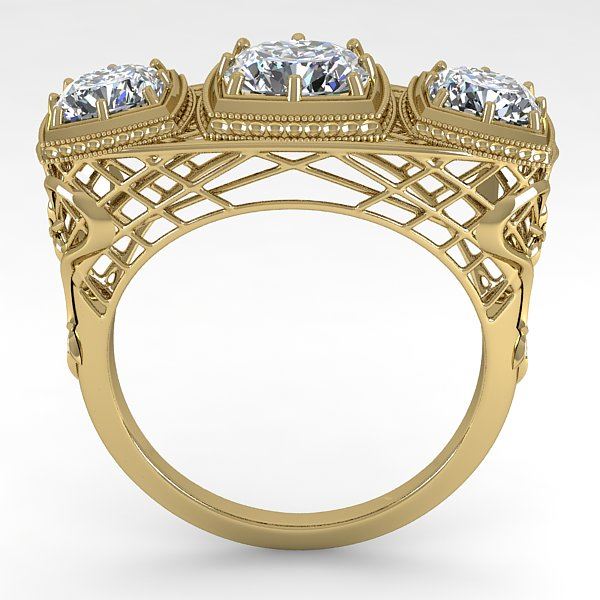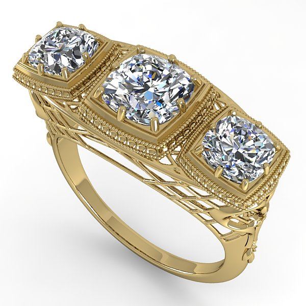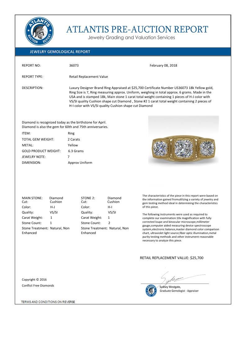 REF-481Y6K -36073 ---- 2 CTW Past Present Future VS/SI Cushion Cut Diamond Ring Deco 18K Yellow Gold ---- Luxury Designer Brand Ring Appraised at $25,700 Certificate Number US36073 18k Yellow gold, Ring Size is 7, Ring measuring approx. Uniform, weighing in total approx. 6 grams. Made in the USA and is stamped 18k, Main stone 1 carat total weight containing 1 pieces of H-J color with VS/SI quality Cushion shape cut Diamond , Stone #2 1 carat total weight containing 2 pieces of H-I color with VS/SI quality Cushion shape cut Diamond