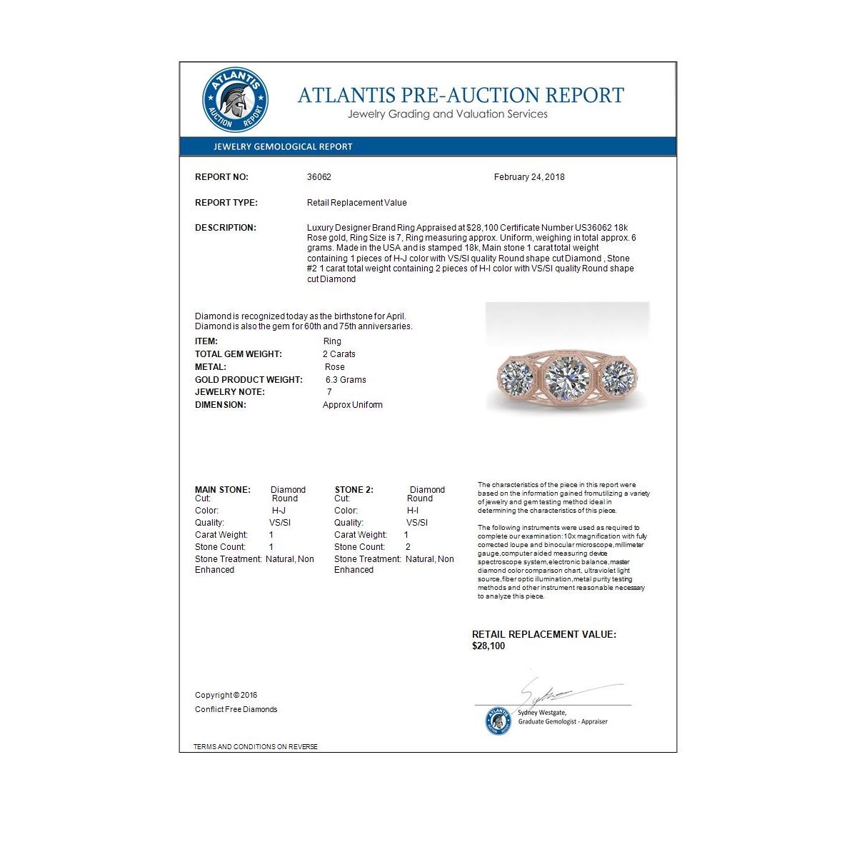 REF-421T6M -36062 ---- 2 CTW Past Present Future VS/SI Diamond Ring 18K Rose Gold ---- Luxury Designer Brand Ring Appraised at $28,100 Certificate Number US36062 18k Rose gold, Ring Size is 7, Ring measuring approx. Uniform, weighing in total approx. 6 grams. Made in the USA and is stamped 18k, Main stone 1 carat total weight containing 1 pieces of H-J color with VS/SI quality Round shape cut Diamond , Stone #2 1 carat total weight containing 2 pieces of H-I color with VS/SI quality Round shape cut Diamond