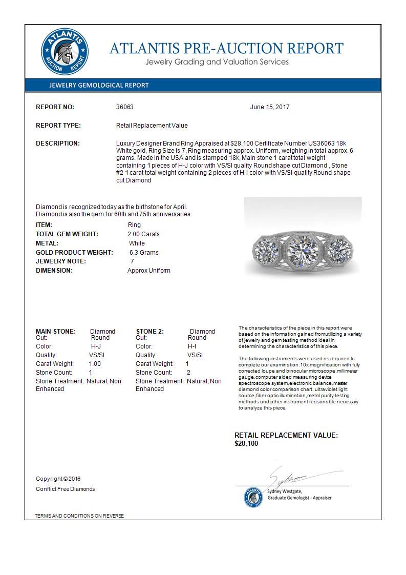 2 CTW Past Present Future VS/SI Diamond Ring 18K White Gold ---- Luxury Designer Brand Ring Appraised Retail Price at $28,100 ---- SKU Number US36063 18k White gold Ring Size is 7, Ring measuring approx. Uniform, weighing in total approx. 6 grams. Made in the USA and is stamped 18k, Main stone 1.00 carat total weight containing 1 pieces of H-J color with VS/SI quality Round shape cut Diamond , Stone #2 1 carat total weight containing 2 pieces of H-I color with VS/SI quality Round shape cut