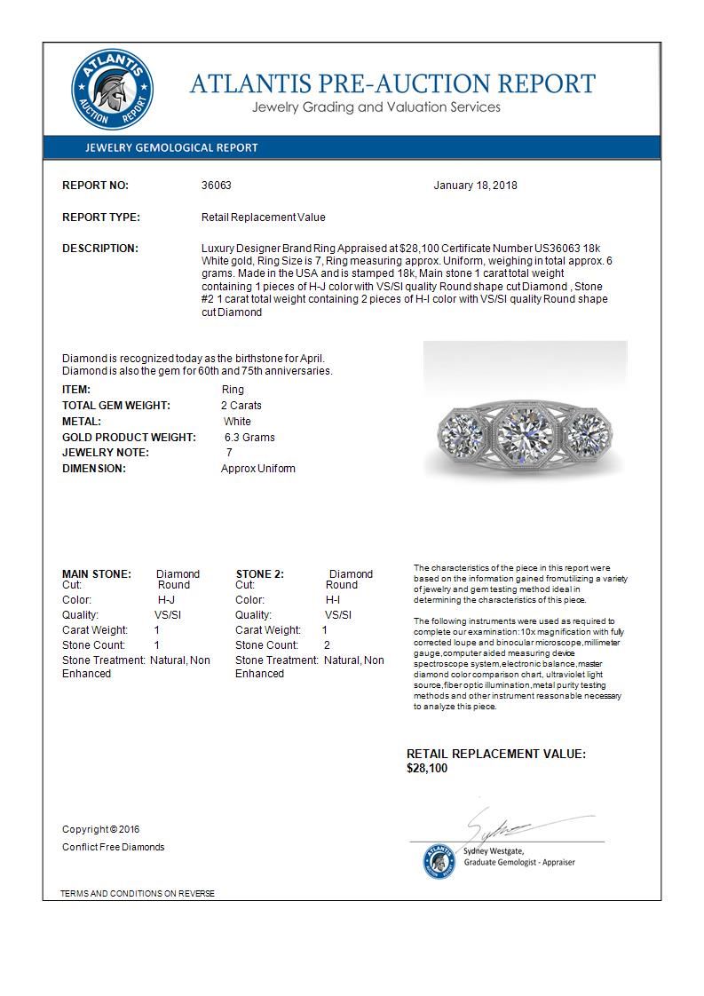 REF-421Y6K -36063 ---- 2 CTW Past Present Future VS/SI Diamond Ring 18K White Gold ---- Luxury Designer Brand Ring Appraised at $28,100 Certificate Number US36063 18k White gold, Ring Size is 7, Ring measuring approx. Uniform, weighing in total approx. 6 grams. Made in the USA and is stamped 18k, Main stone 1 carat total weight containing 1 pieces of H-J color with VS/SI quality Round shape cut Diamond , Stone #2 1 carat total weight containing 2 pieces of H-I color with VS/SI quality Round shape cut Diamond