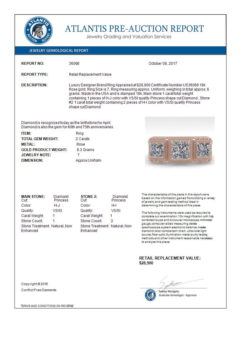 36068 - REF-481R6K ---- 2 CTW Past Present Future VS/SI Princess Diamond Ring 18K Rose Gold ---- Luxury Designer Brand Ring Appraised at $28,900 Certificate Number US36068 18k Rose gold, Ring Size is 7, Ring measuring approx. Uniform, weighing in total approx. 6 grams. Made in the USA and is stamped 18k, Main stone 1 carat total weight containing 1 pieces of H-J color with VS/SI quality Princess shape cut Diamond , Stone #2 1 carat total weight containing 2 pieces of H-I color with VS/SI quality Princess shape cut Diamond