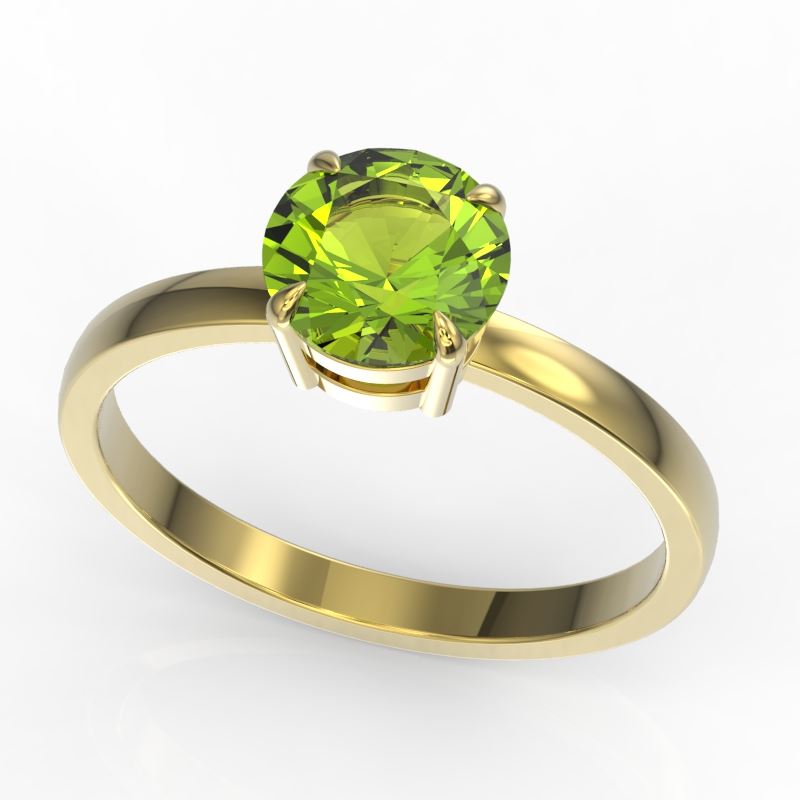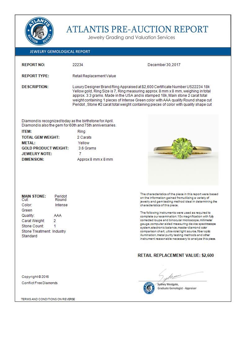 REF-36T2M -22234 ---- 2 CTW Peridot Designer Inspired Solitaire Engagement Ring 18K Yellow Gold ---- Luxury Designer Brand Ring Appraised at $2,600 Certificate Number US22234 18k Yellow gold, Ring Size is 7, Ring measuring approx. 8 mm x 8 mm, weighing in total approx. 3.3 grams. Made in the USA and is stamped 18k, Main stone 2 carat total weight containing 1 pieces of Intense Green color with AAA quality Round shape cut Peridot , Stone #2 carat total weight containing pieces of color with quality shape cut