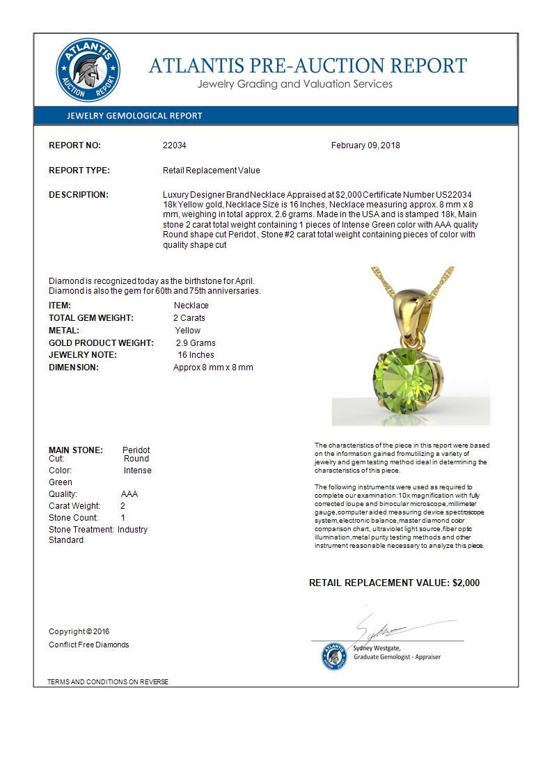 REF-27X8T -22034 ---- 2 CTW Peridot Designer Inspired Solitaire Necklace 18K Yellow Gold ---- Luxury Designer Brand Necklace Appraised at $2,000 Certificate Number US22034 18k Yellow gold, Necklace Size is 16 Inches, Necklace measuring approx. 8 mm x 8 mm, weighing in total approx. 2.6 grams. Made in the USA and is stamped 18k, Main stone 2 carat total weight containing 1 pieces of Intense Green color with AAA quality Round shape cut Peridot , Stone #2 carat total weight containing pieces of color with quality shape cut