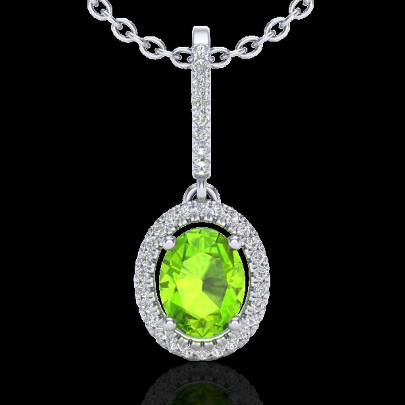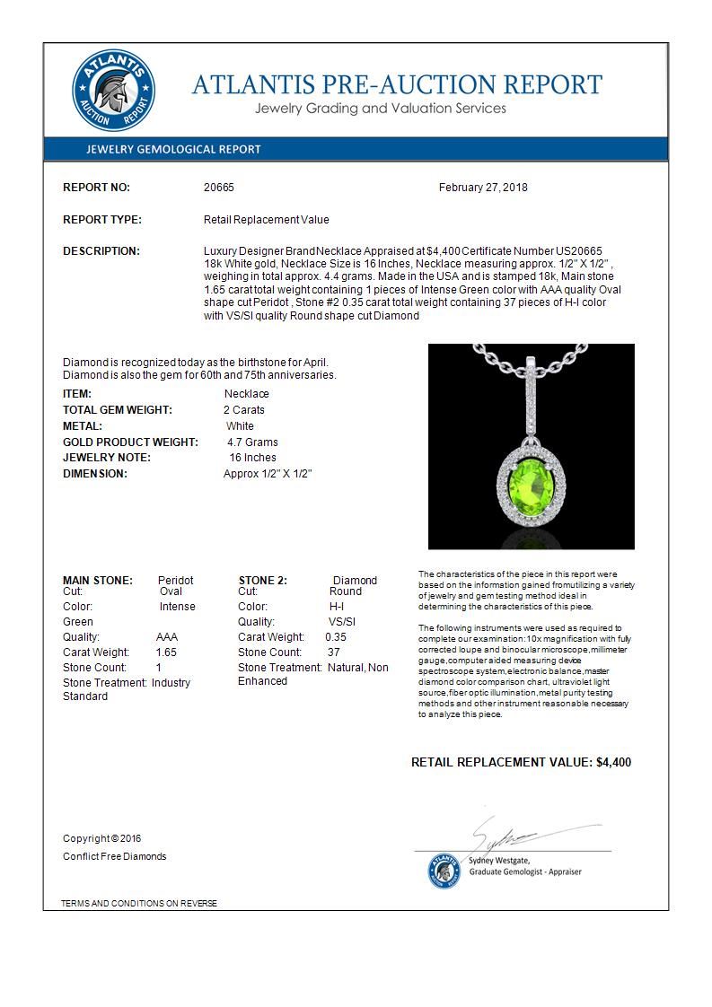 REF-61T8M -20665 ---- 2 CTW Peridot & Micro Pave VS/SI Diamond Necklace Solitaire Halo 18K White Gold ---- Luxury Designer Brand Necklace Appraised at $4,400 Certificate Number US20665 18k White gold, Necklace Size is 16 Inches, Necklace measuring approx. 1/2" X 1/2" , weighing in total approx. 4.4 grams. Made in the USA and is stamped 18k, Main stone 1.65 carat total weight containing 1 pieces of Intense Green color with AAA quality Oval shape cut Peridot , Stone #2 0.35 carat total weight containing 37 pieces of H-I color with VS/SI quality Round shape cut Diamond