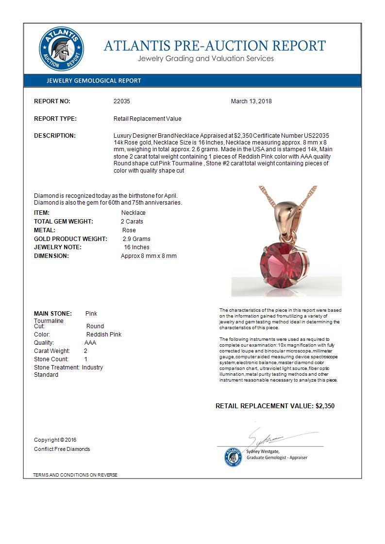REF-32M8H -22035 ---- 2 CTW Pink Tourmaline Designer Solitaire Necklace 14K Rose Gold ---- Luxury Designer Brand Necklace Appraised at $2,350 Certificate Number US22035 14k Rose gold, Necklace Size is 16 Inches, Necklace measuring approx. 8 mm x 8 mm, weighing in total approx. 2.6 grams. Made in the USA and is stamped 14k, Main stone 2 carat total weight containing 1 pieces of Reddish Pink color with AAA quality Round shape cut Pink Tourmaline , Stone #2 carat total weight containing pieces of color with quality shape cut