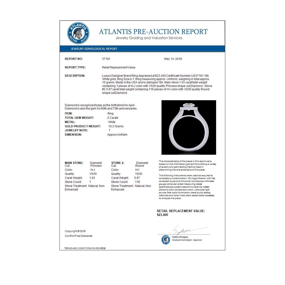 REF-472A8X -37181 ---- 2 CTW Princess VS/SI Diamond Solitaire Micro Pave Ring 18K White Gold ---- Luxury Designer Brand Ring Appraised at $23,400 Certificate Number US37181  18k White gold,  Ring Size is 7, Ring measuring approx. Uniform, weighing in total approx. 10 grams. Made in the USA and is stamped 18k, Main stone 1.03 carat total weight containing 1 pieces of H-J color with VS/SI quality Princess shape cut Diamond , Stone #2 0.97 carat total weight containing 116 pieces of H-I color with  VS/SI quality Round shape cut Diamond