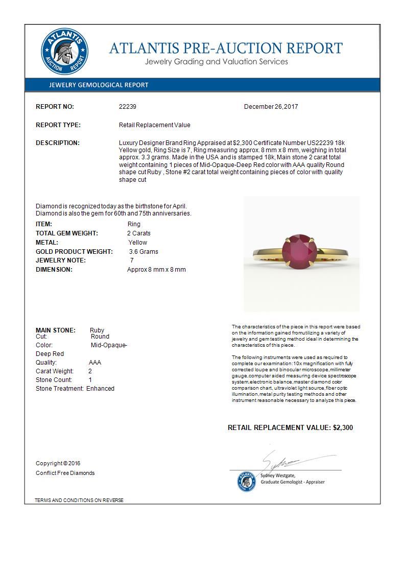REF-35T3M -22239 ---- 2 CTW Ruby Designer Inspired Solitaire Engagement Ring 18K Yellow Gold ---- Luxury Designer Brand Ring Appraised at $2,300 Certificate Number US22239 18k Yellow gold, Ring Size is 7, Ring measuring approx. 8 mm x 8 mm, weighing in total approx. 3.3 grams. Made in the USA and is stamped 18k, Main stone 2 carat total weight containing 1 pieces of Mid-Opaque-Deep Red color with AAA quality Round shape cut Ruby , Stone #2 carat total weight containing pieces of color with quality shape cut