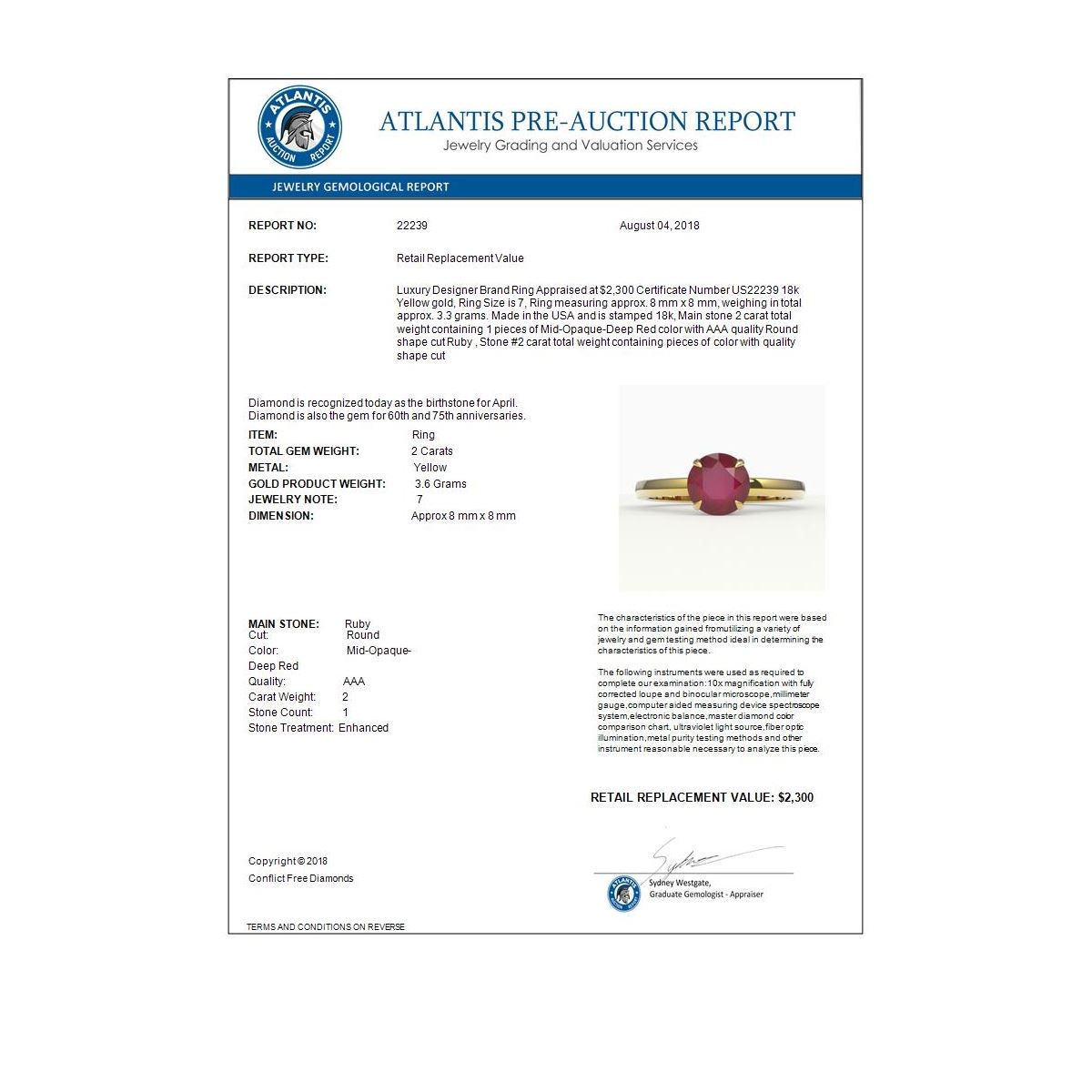 REF-35T3M -22239 ---- 2 CTW Ruby Designer Inspired Solitaire Engagement Ring 18K Yellow Gold ---- Luxury Designer Brand Ring Appraised at $2,300 Certificate Number US22239 18k Yellow gold, Ring Size is 7, Ring measuring approx. 8 mm x 8 mm, weighing in total approx. 3.3 grams. Made in the USA and is stamped 18k, Main stone 2 carat total weight containing 1 pieces of Mid-Opaque-Deep Red color with AAA quality Round shape cut Ruby , Stone #2 carat total weight containing pieces of color with quality shape cut