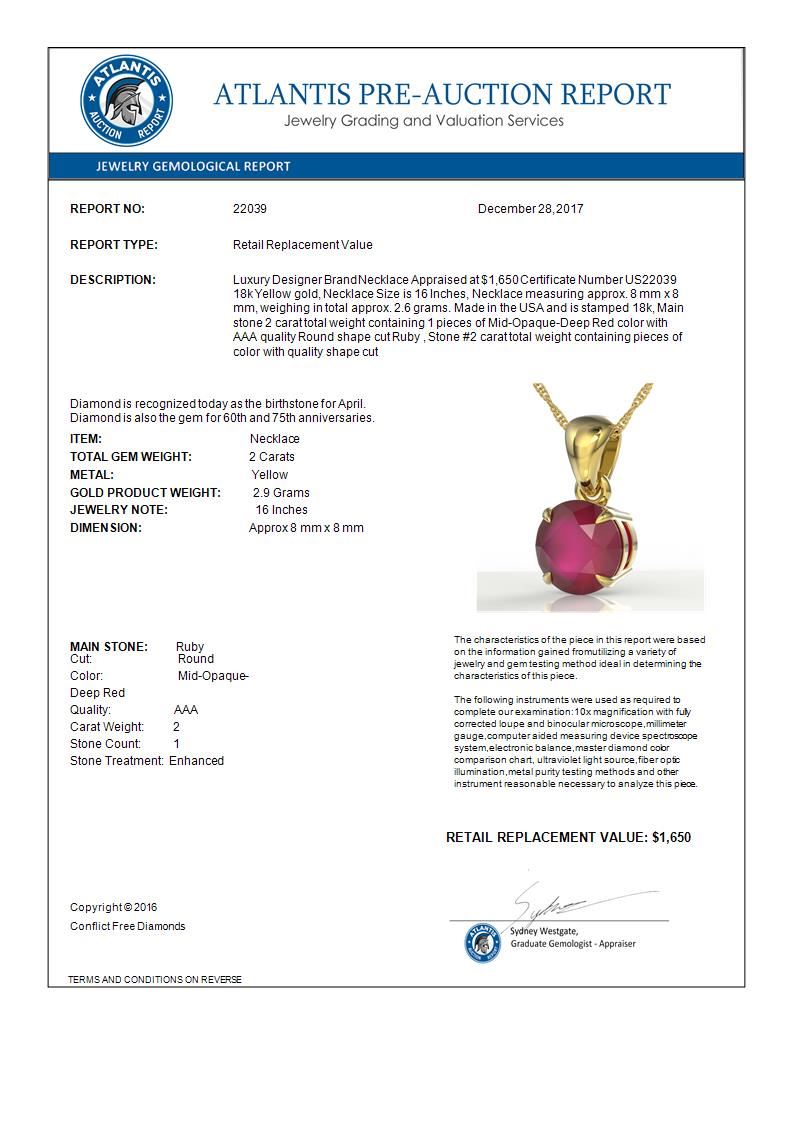 REF-24N9Y -22039 ---- 2 CTW Ruby Designer Inspired Solitaire Necklace 18K Yellow Gold ---- Luxury Designer Brand Necklace Appraised at $1,650 Certificate Number US22039 18k Yellow gold, Necklace Size is 16 Inches, Necklace measuring approx. 8 mm x 8 mm, weighing in total approx. 2.6 grams. Made in the USA and is stamped 18k, Main stone 2 carat total weight containing 1 pieces of Mid-Opaque-Deep Red color with AAA quality Round shape cut Ruby , Stone #2 carat total weight containing pieces of color with quality shape cut