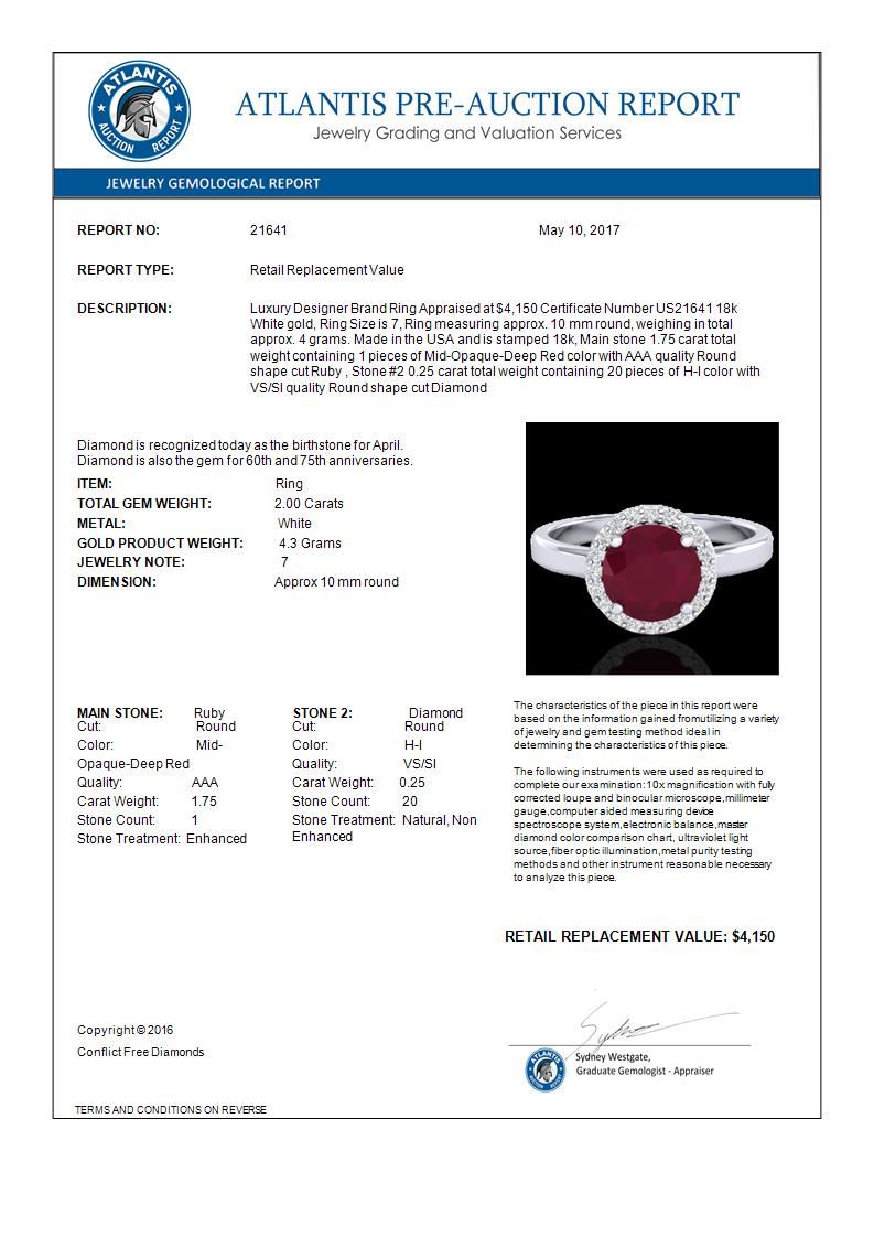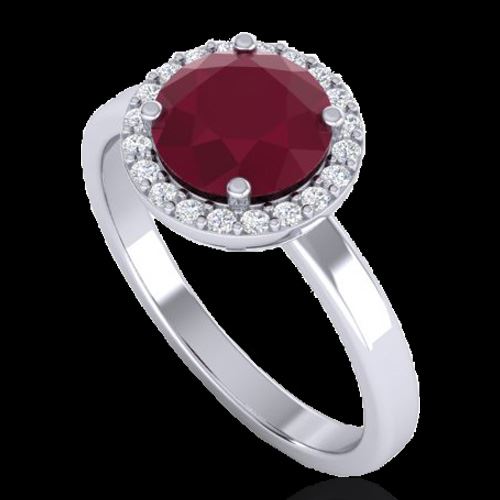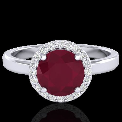 2 CTW Ruby & Halo VS/SI Diamond Micro Pave Ring Solitaire 18K White Gold ---- Luxury Designer Brand Ring Appraised Retail Price at $4,150 ---- SKU Number US21641 18k White gold Ring Size is 7, Ring measuring approx. 10 mm round, weighing in total approx. 4 grams. Made in the USA and is stamped 18k, Main stone 1.75 carat total weight containing 1 pieces of Mid-Opaque-Deep Red color with AAA quality Round shape cut Ruby , Stone #2 0.25 carat total weight containing 20 pieces of H-I color with VS/SI quality Round shape cut