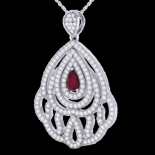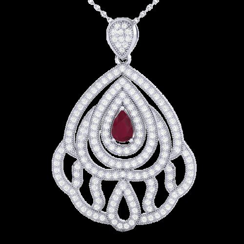 REF-178A2X -21269 ---- 2 CTW Ruby & Micro Pave VS/SI Diamond Designer Necklace 18K White Gold ---- Luxury Designer Brand Necklace Appraised at $13,700 Certificate Number US21269 18k White gold, Necklace Size is 16 Inches, Necklace measuring approx. 1 1/2" X 1" , weighing in total approx. 8.4 grams. Made in the USA and is stamped 18k, Main stone 0.5 carat total weight containing 1 pieces of Mid-Opaque-Deep Red color with AAA quality Pear shape cut Ruby , Stone #2 1.5 carat total weight containing 172 pieces of H-I color with VS/SI quality Round shape cut Diamond