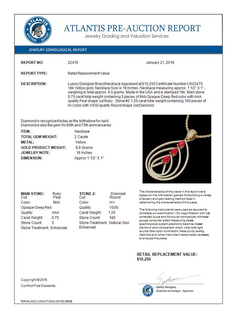 REF-133N3Y -22470 ---- 2 CTW Ruby & Micro Pave VS/SI Diamond Designer Necklace 18K Yellow Gold ---- Luxury Designer Brand Necklace Appraised at $10,250 Certificate Number US22470 18k Yellow gold, Necklace Size is 16 Inches, Necklace measuring approx. 1 1/2" X 1" , weighing in total approx. 8.5 grams. Made in the USA and is stamped 18k, Main stone 0.75 carat total weight containing 3 pieces of Mid-Opaque-Deep Red color with AAA quality Pear shape cut Ruby , Stone #2 1.25 carat total weight containing 180 pieces of H-I color with VS/SI quality Round shape cut Diamond