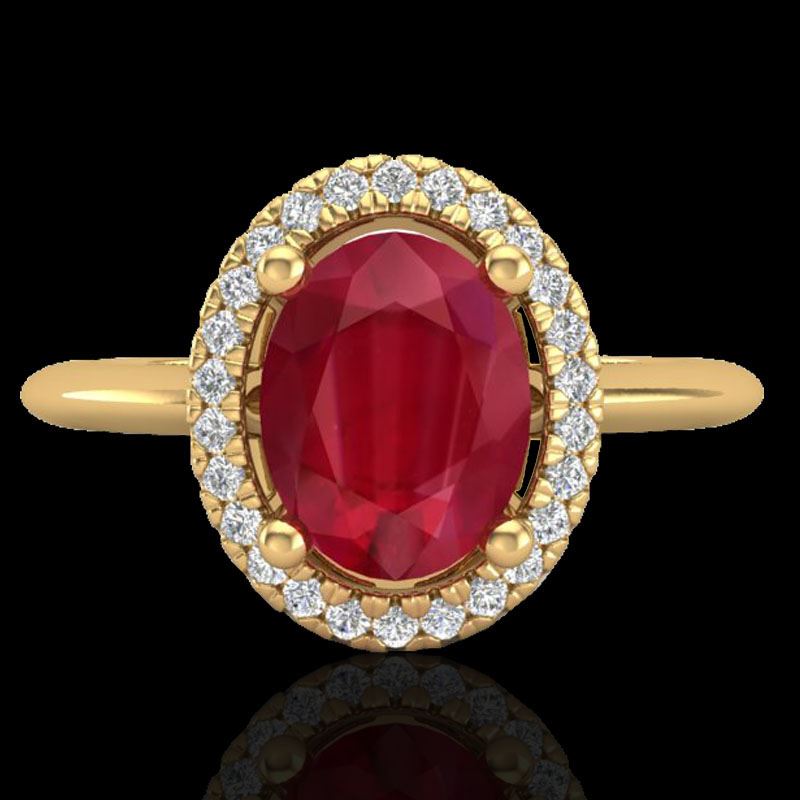 REF-56M9H -21019 ---- 2 CTW Ruby & Micro Pave VS/SI Diamond Ring Solitaire Halo 18K Yellow Gold ---- Luxury Designer Brand Ring Appraised at $4,050 Certificate Number US21019 18k Yellow gold, Ring Size is 7, Ring measuring approx. 1/2" X 1/2" , weighing in total approx. 3.5 grams. Made in the USA and is stamped 18k, Main stone 1.77 carat total weight containing 1 pieces of Mid-Opaque-Deep Red color with AAA quality Oval shape cut Ruby , Stone #2 0.23 carat total weight containing 27 pieces of H-I color with VS/SI quality Round shape cut Diamond