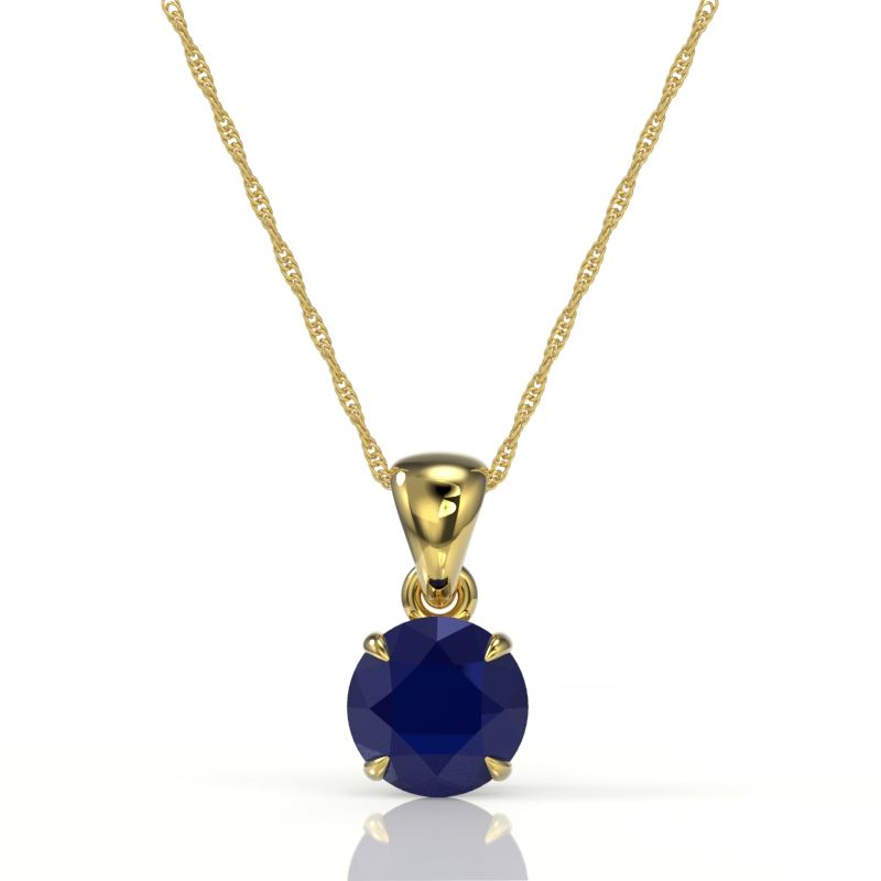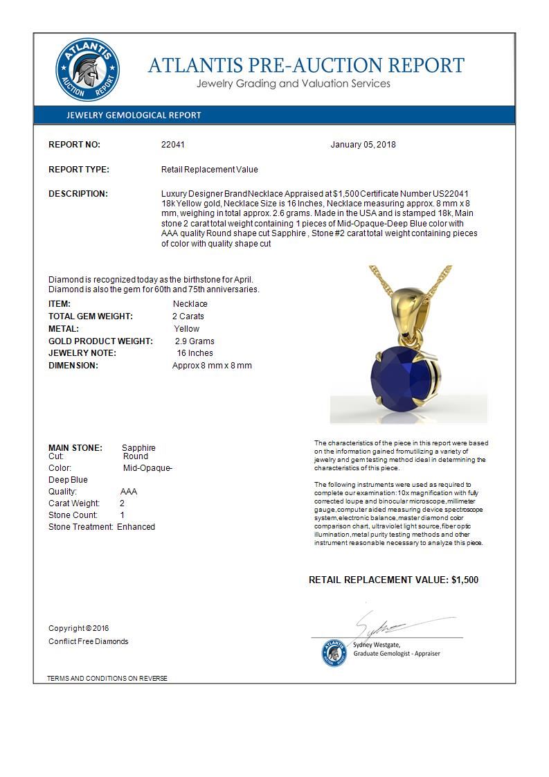 REF-24T5M -22041 ---- 2 CTW Sapphire Designer Inspired Solitaire Necklace 18K Yellow Gold ---- Luxury Designer Brand Necklace Appraised at $1,500 Certificate Number US22041 18k Yellow gold, Necklace Size is 16 Inches, Necklace measuring approx. 8 mm x 8 mm, weighing in total approx. 2.6 grams. Made in the USA and is stamped 18k, Main stone 2 carat total weight containing 1 pieces of Mid-Opaque-Deep Blue color with AAA quality Round shape cut Sapphire , Stone #2 carat total weight containing pieces of color with quality shape cut