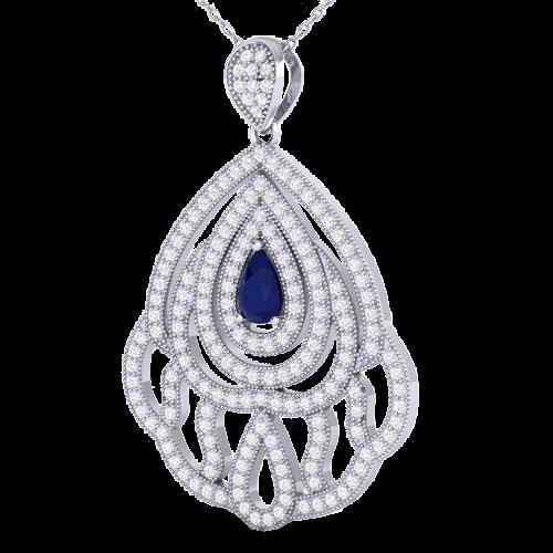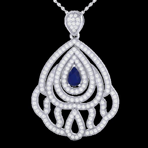 REF-178M2H -21271 ---- 2 CTW Sapphire & Micro Pave VS/SI Diamond Designer Necklace 18K White Gold ---- Luxury Designer Brand Necklace Appraised at $13,700 Certificate Number US21271 18k White gold, Necklace Size is 16 Inches, Necklace measuring approx. 1 1/2" X 1" , weighing in total approx. 8.4 grams. Made in the USA and is stamped 18k, Main stone 0.5 carat total weight containing 1 pieces of Mid-Opaque-Deep Blue color with AAA quality Pear shape cut Sapphire , Stone #2 1.5 carat total weight containing 172 pieces of H-I color with VS/SI quality Round shape cut Diamond