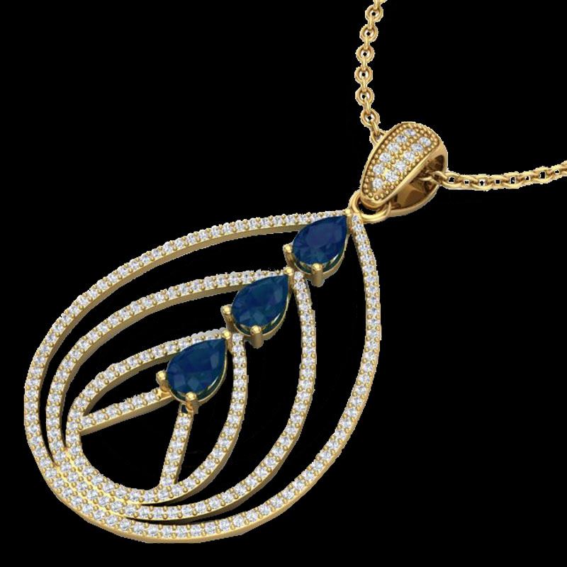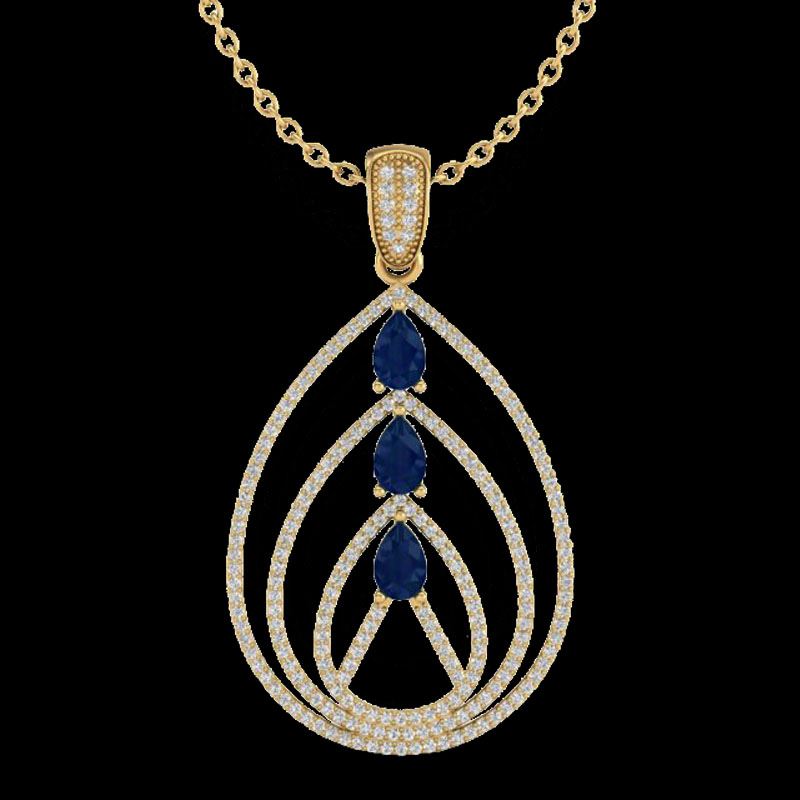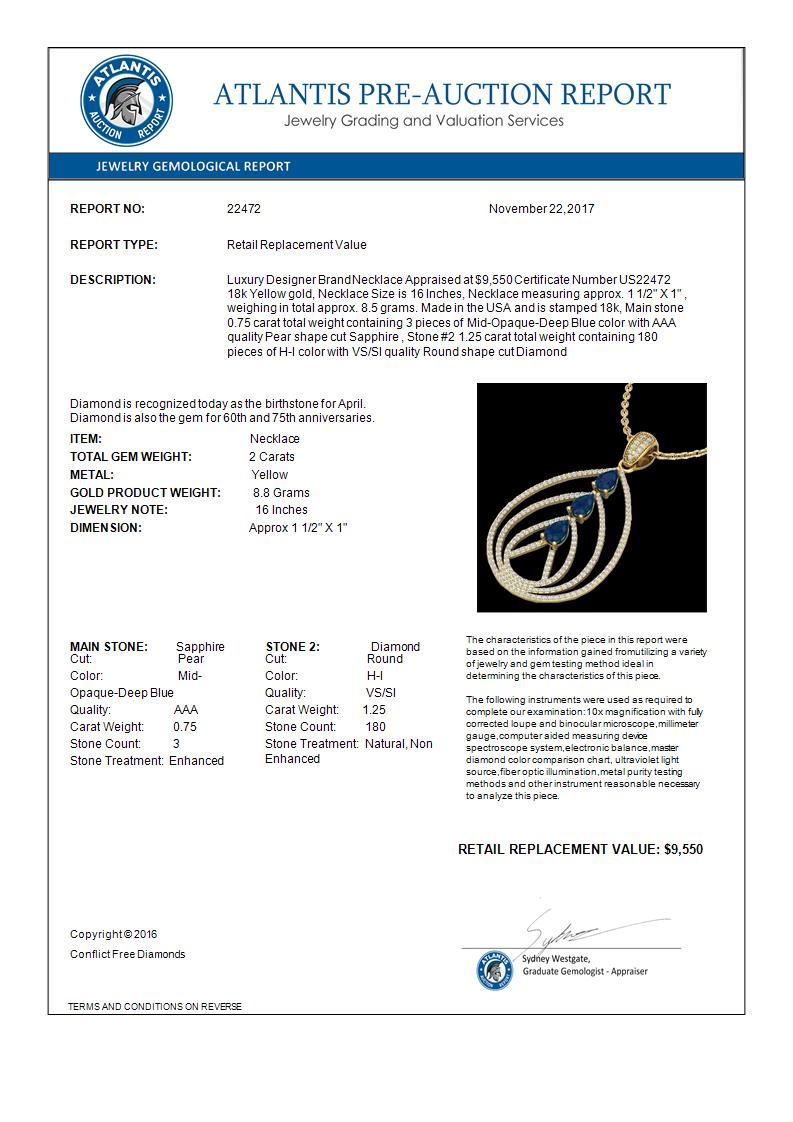 REF-133W3F -22472 ---- 2 CTW Sapphire & Micro Pave VS/SI Diamond Designer Necklace 18K Yellow Gold ---- Luxury Designer Brand Necklace Appraised at $9,550 Certificate Number US22472 18k Yellow gold, Necklace Size is 16 Inches, Necklace measuring approx. 1 1/2" X 1" , weighing in total approx. 8.5 grams. Made in the USA and is stamped 18k, Main stone 0.75 carat total weight containing 3 pieces of Mid-Opaque-Deep Blue color with AAA quality Pear shape cut Sapphire , Stone #2 1.25 carat total weight containing 180 pieces of H-I color with VS/SI quality Round shape cut Diamond