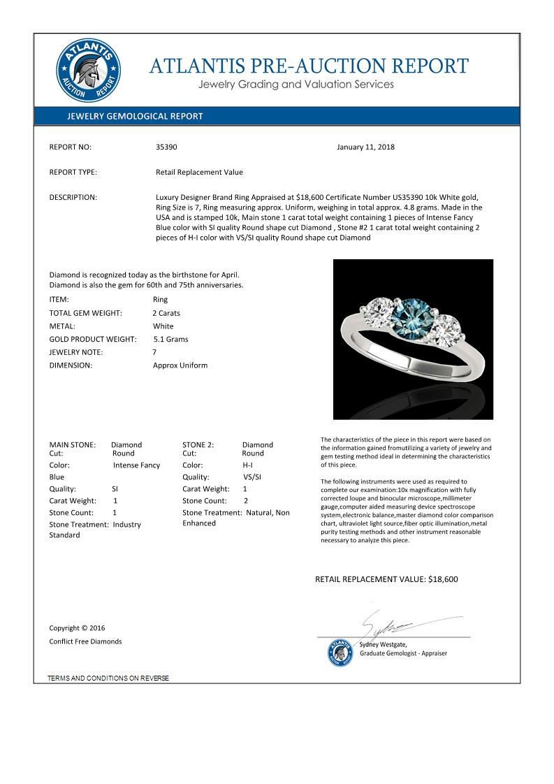 REF-281X8T -35390 ---- 2 CTW Si Certified Fancy Blue Diamond 3 Stone Solitaire Ring 10K White Gold ---- Luxury Designer Brand Ring Appraised at $18,600 Certificate Number US35390 10k White gold, Ring Size is 7, Ring measuring approx. Uniform, weighing in total approx. 4.8 grams. Made in the USA and is stamped 10k, Main stone 1 carat total weight containing 1 pieces of Intense Fancy Blue color with SI quality Round shape cut Diamond , Stone #2 1 carat total weight containing 2 pieces of H-I color with VS/SI quality Round shape cut Diamond