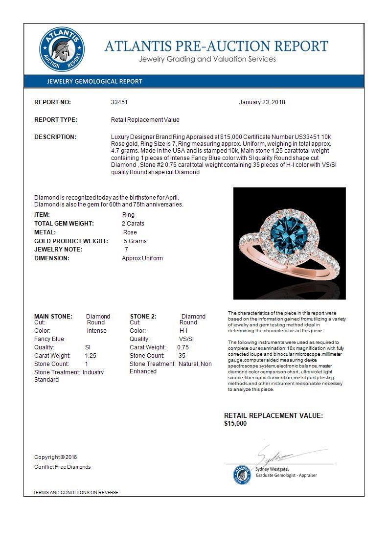 REF-227W3F -33451 ---- 2 CTW Si Certified Fancy Blue Diamond Solitaire Halo Ring 10K Rose Gold ---- Luxury Designer Brand Ring Appraised at $15,000 Certificate Number US33451 10k Rose gold, Ring Size is 7, Ring measuring approx. Uniform, weighing in total approx. 4.7 grams. Made in the USA and is stamped 10k, Main stone 1.25 carat total weight containing 1 pieces of Intense Fancy Blue color with SI quality Round shape cut Diamond , Stone #2 0.75 carat total weight containing 35 pieces of H-I color with VS/SI quality Round shape cut Diamond