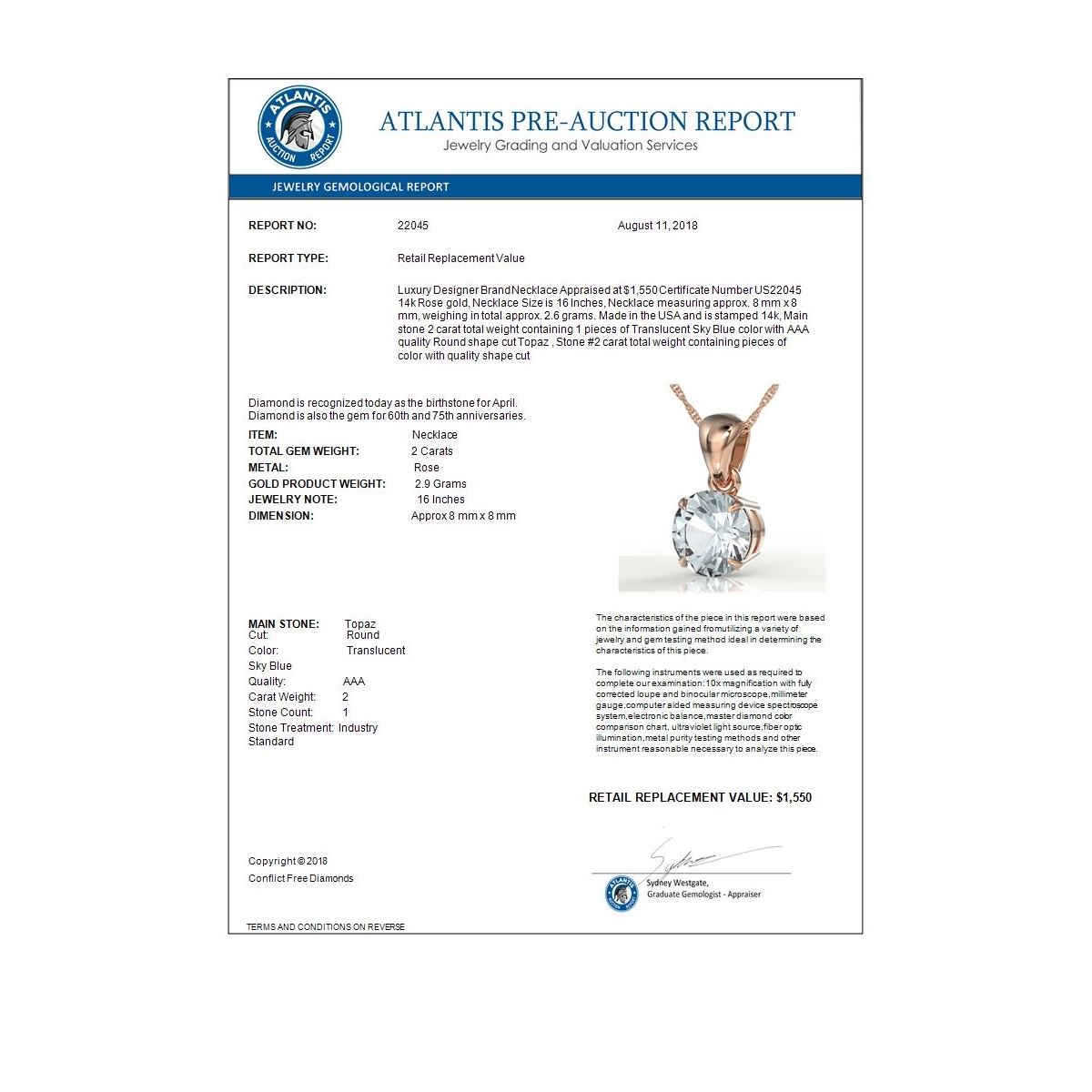REF-23H3A -22045 ---- 2 CTW Sky Blue Topaz Designer Inspired Solitaire Necklace 14K Rose Gold ---- Luxury Designer Brand Necklace Appraised at $1,550 Certificate Number US22045 14k Rose gold, Necklace Size is 16 Inches, Necklace measuring approx. 8 mm x 8 mm, weighing in total approx. 2.6 grams. Made in the USA and is stamped 14k, Main stone 2 carat total weight containing 1 pieces of Translucent Sky Blue color with AAA quality Round shape cut Topaz , Stone #2 carat total weight containing pieces of color with quality shape cut