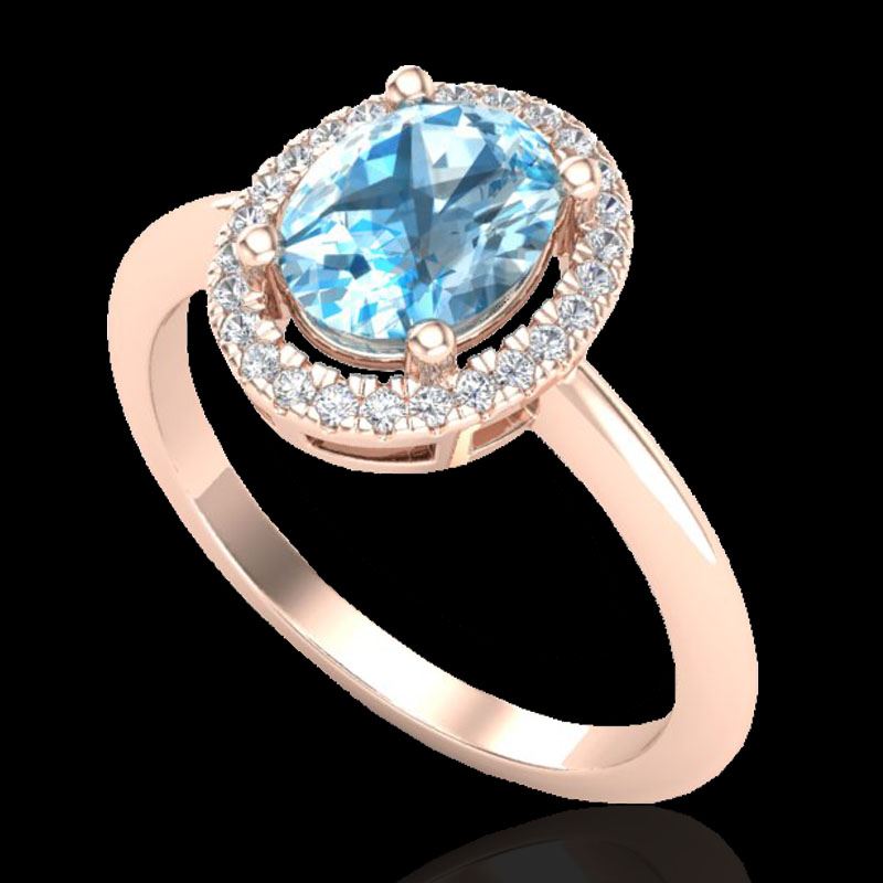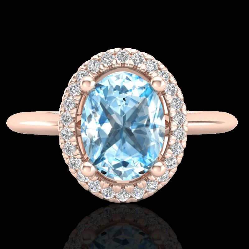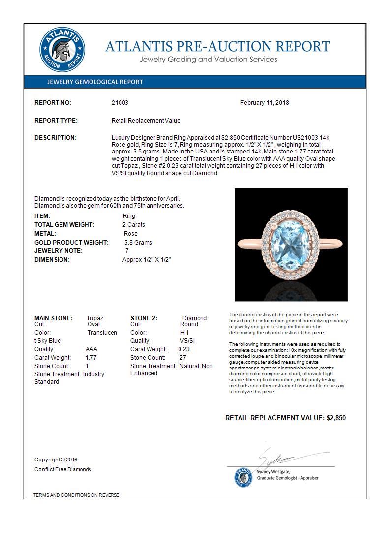 REF-40W2F -21003 ---- 2 CTW Sky Blue Topaz & Micro VS/SI Diamond Ring Solitaire Halo 14K Rose Gold ---- Luxury Designer Brand Ring Appraised at $2,850 Certificate Number US21003 14k Rose gold, Ring Size is 7, Ring measuring approx. 1/2" X 1/2" , weighing in total approx. 3.5 grams. Made in the USA and is stamped 14k, Main stone 1.77 carat total weight containing 1 pieces of Translucent Sky Blue color with AAA quality Oval shape cut Topaz , Stone #2 0.23 carat total weight containing 27 pieces of H-I color with VS/SI quality Round shape cut Diamond