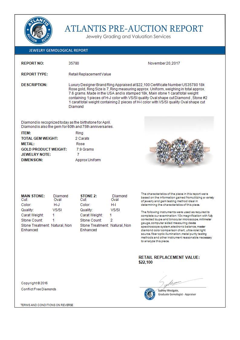 REF-414A2X -35780 ---- 2 CTW Solitaire Past Present Future VS/SI Oval Cut Diamond Ring 18K Rose Gold ---- Luxury Designer Brand Ring Appraised at $22,100 Certificate Number US35780 18k Rose gold, Ring Size is 7, Ring measuring approx. Uniform, weighing in total approx. 7.6 grams. Made in the USA and is stamped 18k, Main stone 1 carat total weight containing 1 pieces of H-J color with VS/SI quality Oval shape cut Diamond , Stone #2 1 carat total weight containing 2 pieces of H-I color with VS/SI quality Oval shape cut Diamond