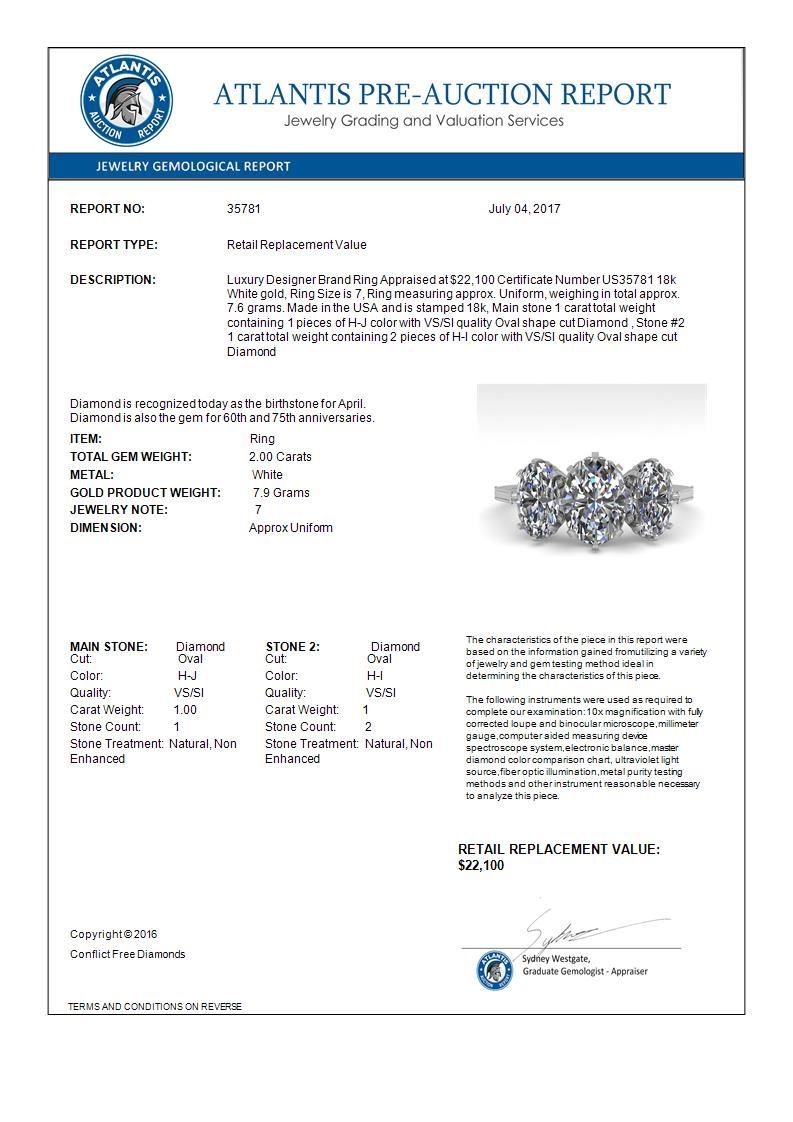2 CTW Solitaire Past Present Future VS/SI Oval Cut Diamond Ring 18K White Gold ---- Luxury Designer Brand Ring Appraised Retail Price at $22,100 ---- SKU Number US35781 18k White gold Ring Size is 7, Ring measuring approx. Uniform, weighing in total approx. 7.6 grams. Made in the USA and is stamped 18k, Main stone 1.00 carat total weight containing 1 pieces of H-J color with VS/SI quality Oval shape cut Diamond , Stone #2 1 carat total weight containing 2 pieces of H-I color with VS/SI quality Oval shape cut