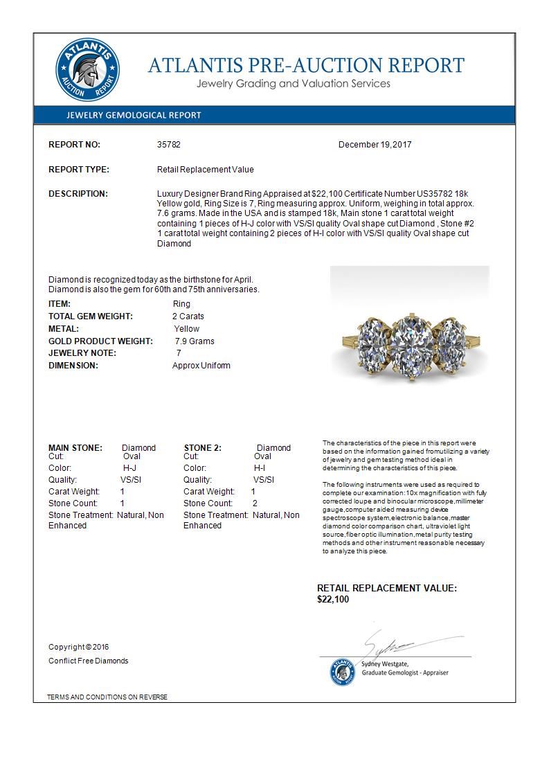 REF-414M2H -35782 ---- 2 CTW Solitaire Past Present Future VS/SI Oval Cut Diamond Ring 18K Yellow Gold ---- Luxury Designer Brand Ring Appraised at $22,100 Certificate Number US35782 18k Yellow gold, Ring Size is 7, Ring measuring approx. Uniform, weighing in total approx. 7.6 grams. Made in the USA and is stamped 18k, Main stone 1 carat total weight containing 1 pieces of H-J color with VS/SI quality Oval shape cut Diamond , Stone #2 1 carat total weight containing 2 pieces of H-I color with VS/SI quality Oval shape cut Diamond