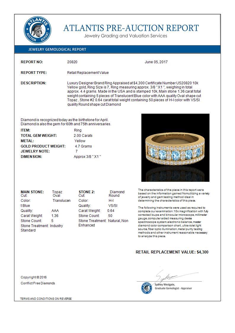 2 CTW Topaz & Micro Pave VS/SI Diamond Designer Inspired Band Ring 10K Yellow Gold ---- Luxury Designer Brand Ring Appraised Retail Price at $4,300 ---- SKU Number US20820 10k Yellow gold Ring Size is 7, Ring measuring approx. 3/8 " X1 ", weighing in total approx. 4.4 grams. Made in the USA and is stamped 10k, Main stone 1.36 carat total weight containing 5 pieces of Translucent Blue color with AAA quality Oval shape cut Topaz , Stone #2 0.64 carat total weight containing 50 pieces of H-I color with VS/SI quality Round shape cut